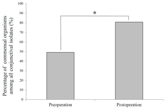 Percentage of commensal organisms among all conjunctival isolates before and after surgery. Coagulase-negative staphylococci and Corynebacterium spp., which are commensal organisms the in normal conjunctival flora, accounted for 49.1% of all isolates before surgery and 80.7% after surgery, representing a significant postoperative increase (p = 0.004, χ2 test). *: Significant difference between pre- and post-operation by the χ2 test.