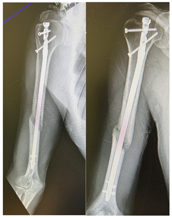 Late complications include infection and nonunion. Infection is a potential adverse event in any surgical procedure, with an incidence of 1.6% in this context [19]. Identification of the responsible pathogen is essential, as it allows for targeted antibiotic therapy and, when necessary, the removal of the implant and infected tissue followed by external fixation. Pseudoarthrosis (PSA) is defined as the absence of fracture healing approximately six months after trauma. It may be hypertrophic or atrophic, depending on the presence or absence of callus formation [20]. The incidence ranges between 8 and 12%, which makes the humeral shaft one of the sites most at risk. Most cases of PSA occur in transverse fractures of the middle third of the shaft.
