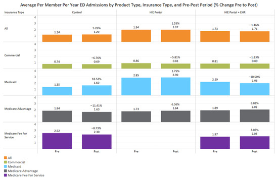 Increasing the number of provider subscribers signifies high value in HIE solutions; however, there is a lack of quantifiable information on the value of these products [5,6,7,8]. This analysis differed from other similar studies in that the post period included any emergency room visit or hospitalization, not just readmissions, and was not limited to ambulatory-sensitive conditions, thereby increasing the refinement of the conclusions [11,12,13,20,21,22,23,24,25,26,27,28,29,30]. The current research study evaluated the impact of providers subscribing to HIE products on patient utilization of emergency department visits and inpatient admissions, observing a decrease in inpatient admissions for HIE portal subscriptions and EHR integration, with a greater reduction observed for EHR-integrated services. This finding aligns with previous observational survey research studies, which indicate that providers who utilize EHRs through HIE services reduce the rate of inpatient admissions, particularly for specialty providers who require more coordination with primary care providers [20]. The emergency room reduction for HIE products across all insurance payer types was not significantly significant. Still, it outperformed the control clinics with an increase of 5.3%, compared to the HIE portal alone (2.6%) and the integrated EHR and web portal (1.8%).