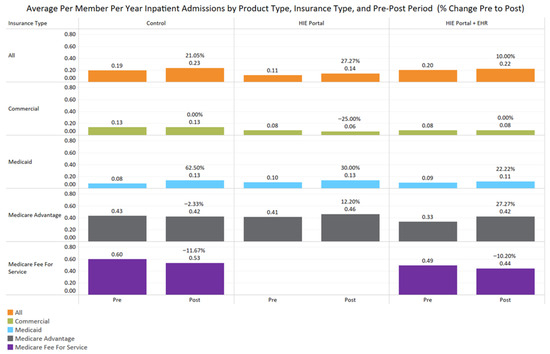 Patients post-intervention: Control clinics experienced an average increase of 21.1% in per-member-per-year (PMPY) inpatient admissions from pre-intervention to post-intervention for all insurance payer types (Figure 2). Patients of providers subscribing to integrated EHR HIE and portal services, as well as those using HIE portal services alone, also experienced an average increase in per-member-per-year inpatient admissions over time, although they were not significantly different from each other. However, the HIE-integrated EHR plus portal services group had a significantly lower increase in admissions from pre- to post-treatment (10%) compared to that for patients in the control group (p = 0.001, Table 2, Figure 2). This finding was replicated in Medicaid enrollees, with a 62.5% increase in per-member-per-year (PMPY) inpatient admissions from pre- to post for the control group (Table 3). In comparison, the increases for both HIE product groups were significantly lower among Medicaid patients, for enrollees using an HIE portal alone (30%, p = 0.04) and those using integrated EHR HIE plus portal services (22.2%, p = 0.001; Table 3, Figure 2).