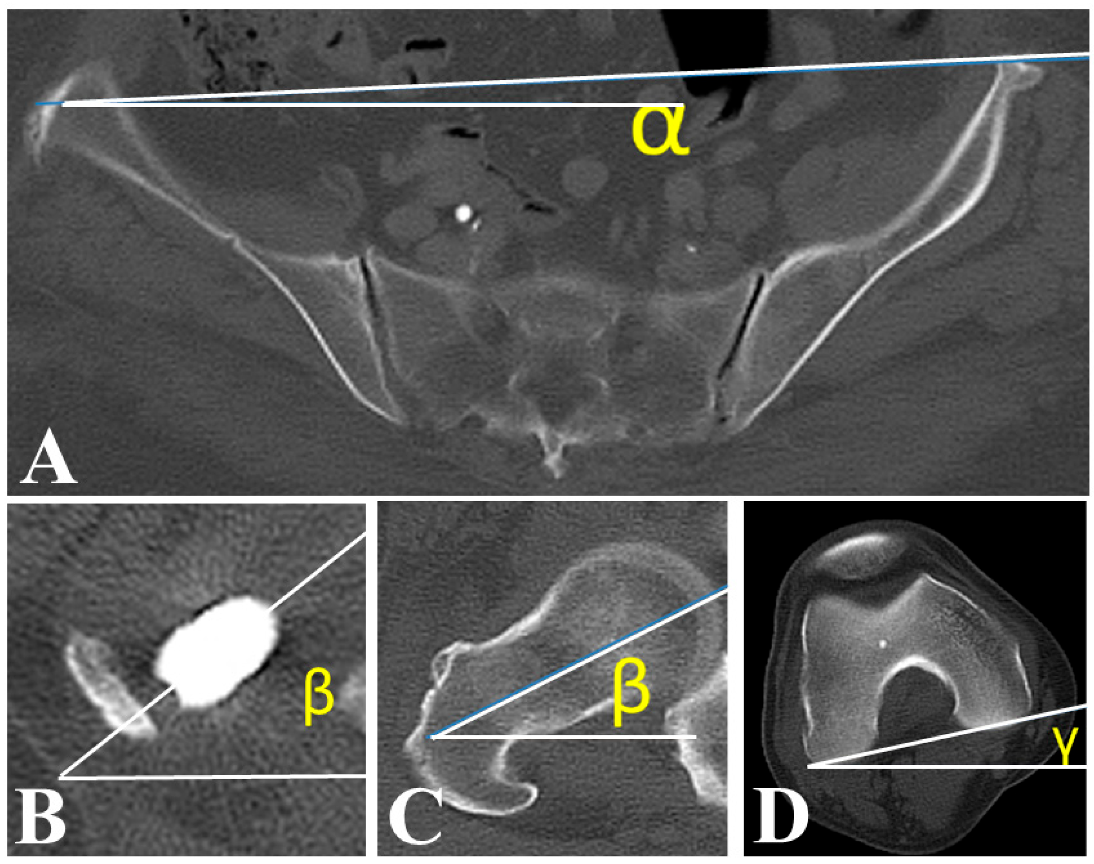 Figure 3. Computed tomography (CT) measurements of femoral rotation angle. (A) Angle α was defined as the angle formed between the CT table line and the line connecting bilateral anterior superior iliac spines. (B,C) Angle β was defined as the angle between the CT table line and the femoral neck axis. (D) Angle γ was defined as the angle between the CT table line and the posterior condylar line. Functional stem anteversion or external rotation angle of the femur was measured by subtracting the value for the rotation angle of the superior anterior iliac spine line from that of the stem angle (β–α) or angle of the posterior femoral condyle axis (γ–α) using a CT image acquired after surgery.