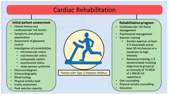 - Hansen, D.; Kraenkel, N.; Kemps, H.; Wilhelm, M.; Abreu, A.; Pfeiffer, A.F.; Jordão, A.; Cornelissen, V.; Völler, H. Management of Patients with Type 2 Diabetes in Cardiovascular Rehabilitation. Eur. J. Prev. Cardiol. 2019, 26, 133–144. [Google Scholar] [CrossRef]