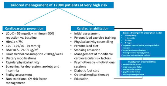 Therefore, the aim of our manuscript is to provide healthcare professionals, particularly physicians, cardiologists, diabetologists, and rehabilitation specialists, with practical guidance for the management of this cohort of patients, addressing different areas ranging from CV prevention to cardiac rehabilitation (CR), to personalized pharmacological treatment.