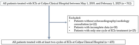 We conducted a retrospective observational study including patients treated with immune checkpoint inhibitors (ICIs) in the Oncology Department of Colțea Clinical Hospital, Bucharest, Romania. The analyzed cohort was derived from an internal clinical database containing information on adverse events and oncological outcomes of patients who received immunotherapy between 1 May 2019, and 1 February 2025.