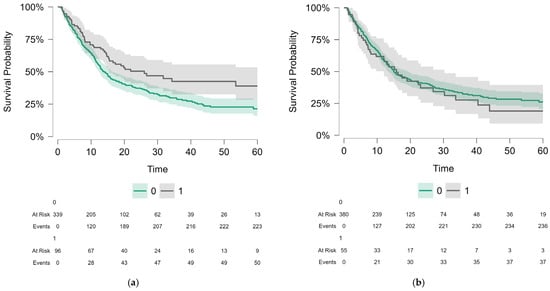 Kaplan-Meyer curves showing the following variables: (a) OS comparison of no non-cardiac irAEs (0) vs. non-cardiac irAEs (1) patients, p-value of 0.008. The curves showed a clear and consistent separation throughout the follow-up period, indicating a favorable prognostic effect of these events. (b) OS comparison of no cardiac irAEs (0) vs. cardiac irAEs patients (1), p-value of 0.56. Although the curves suggest a trend toward poorer prognosis in the presence of cardiac toxicities, the lack of statistical significance likely reflects both the low incidence of these events and the limitations of statistical power. These findings highlight the contrast between non-cardiac irAEs, which correlate with survival benefits, and cardiac irAEs, which remain rare but carry distinct prognostic implications.