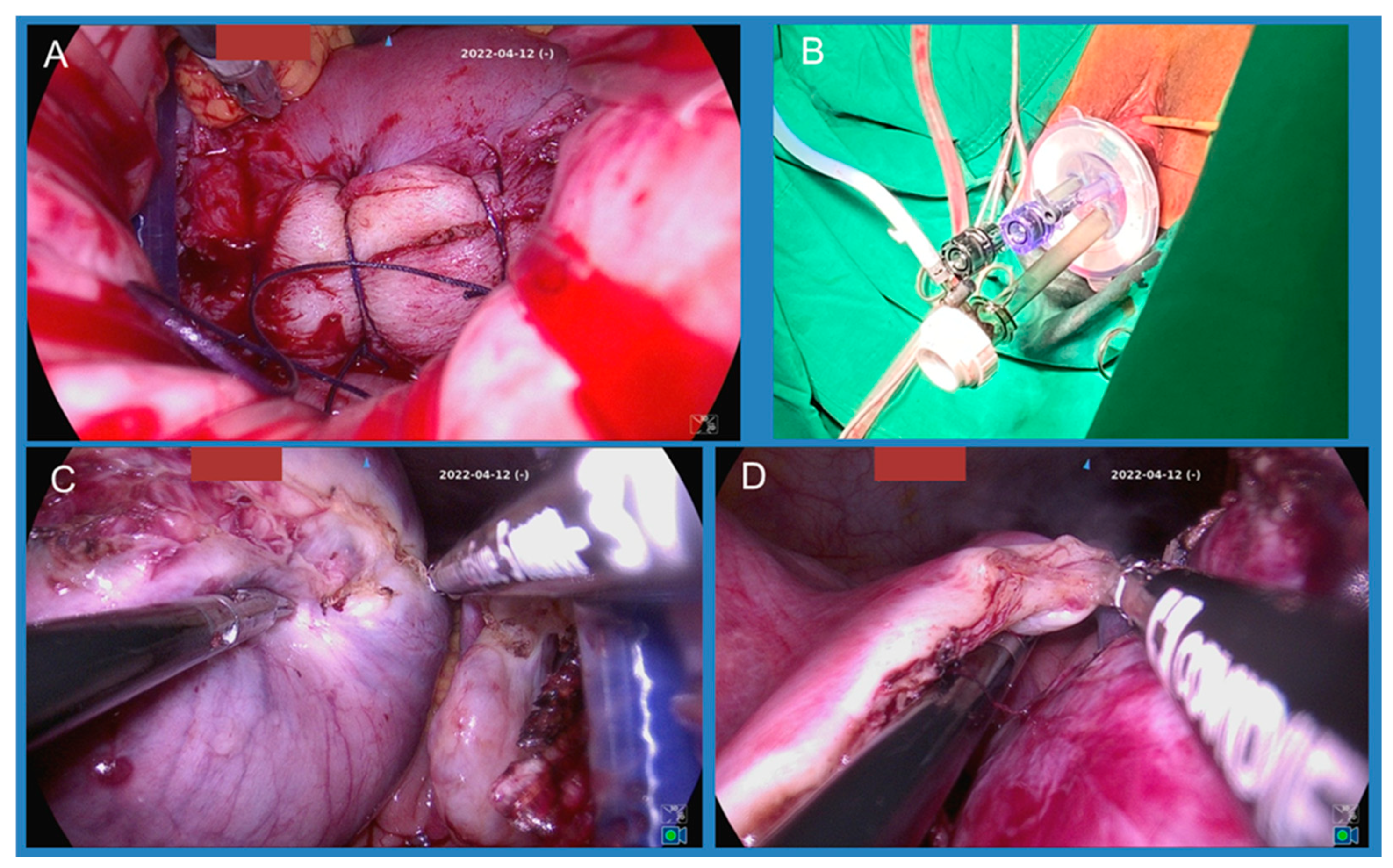 Figure 1. (A) Colpotomy and cervical amputation were performed; (B) the wound retractor with cap and trocars were placed; (C,D) bilateral broad ligaments, ovarian ligaments, and fallopian tubes were coagulated and cut.