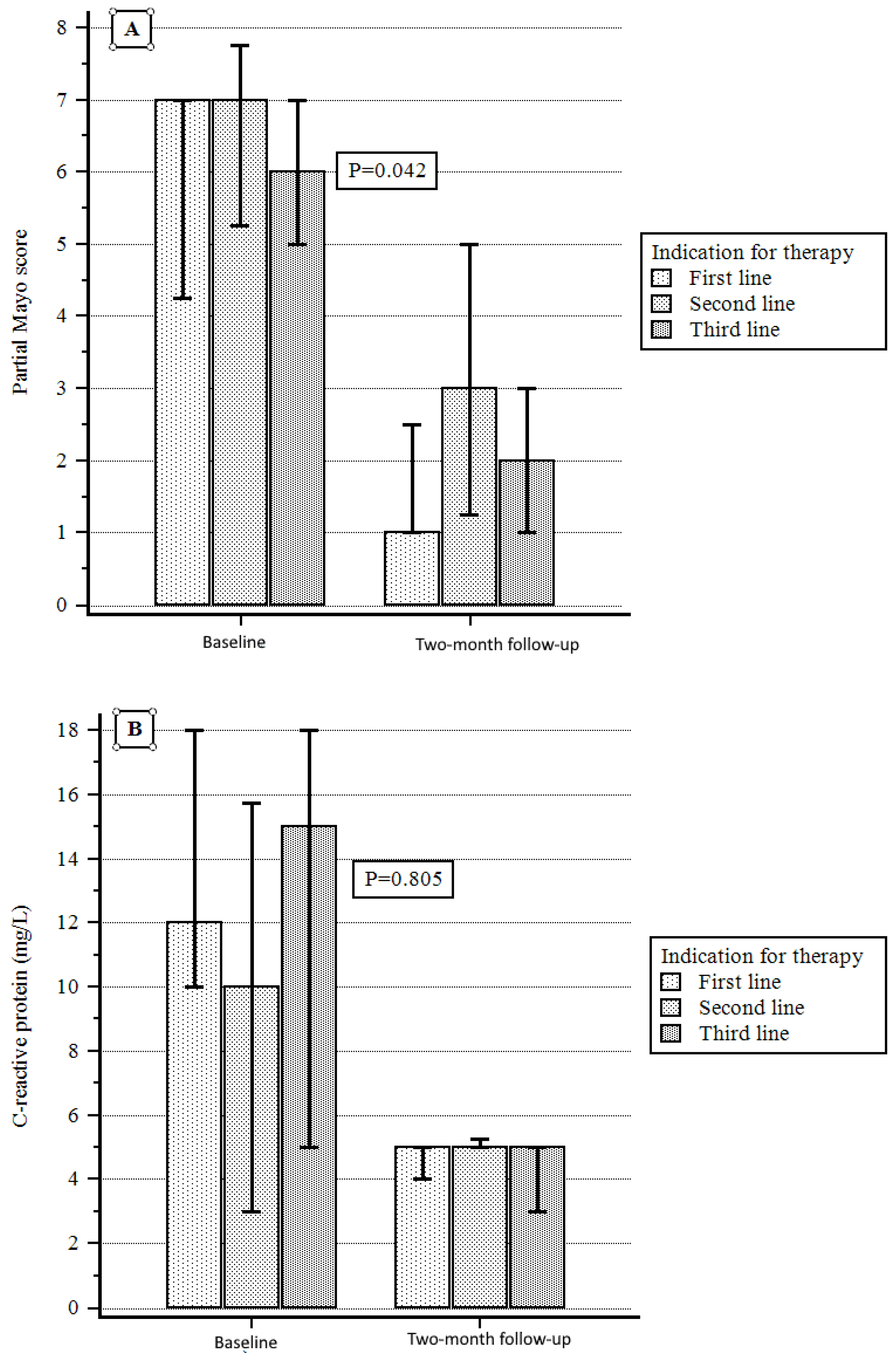 - Steroid-free clinical remission at week 8 and at the end of follow-up, defined as a PMS ≤ 1 and the absence of steroid treatment [25];