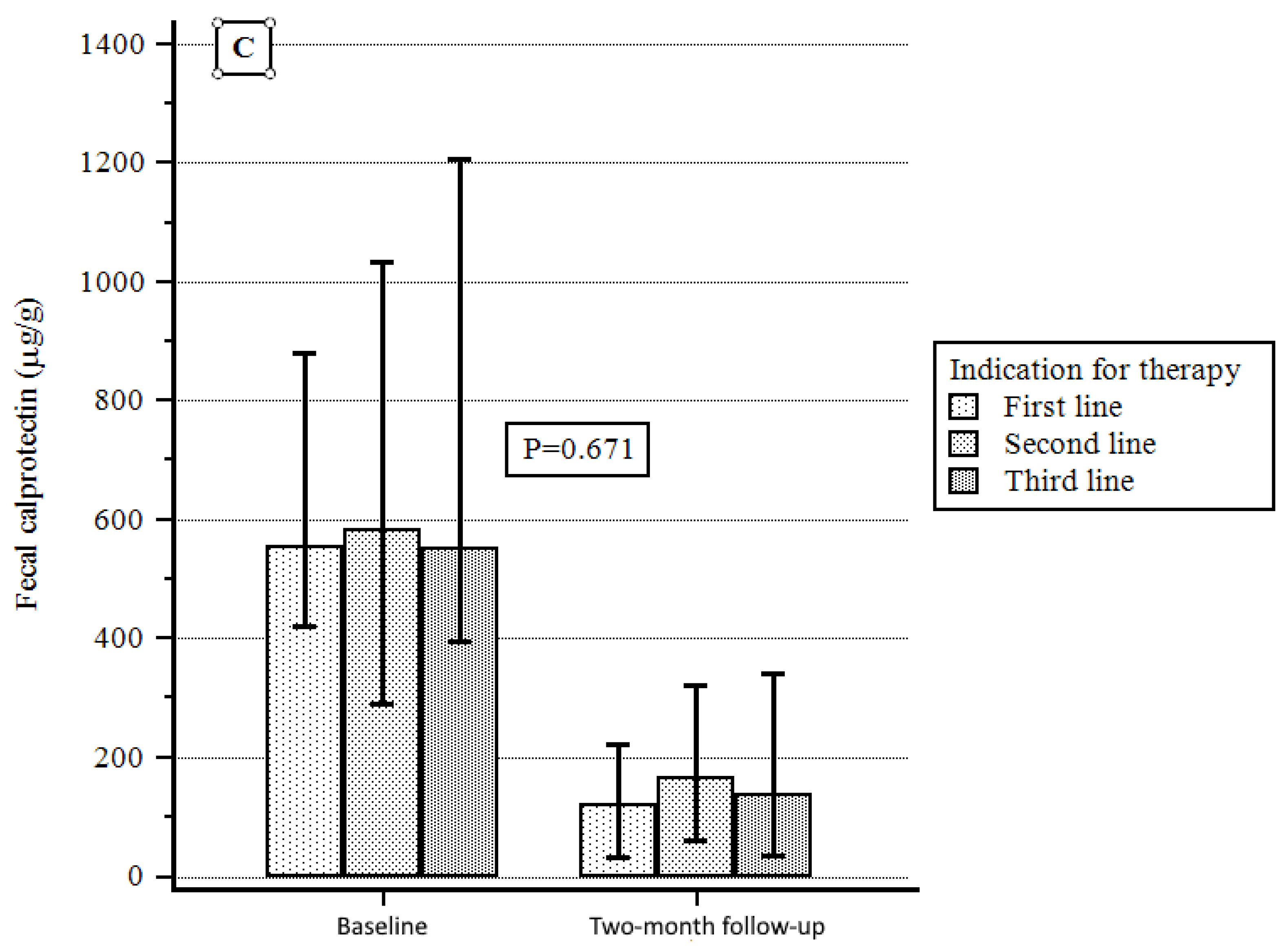 - CRP, FC, and PMS short-term variations between 0 and 8 weeks according to the number of previous biological therapies performed;