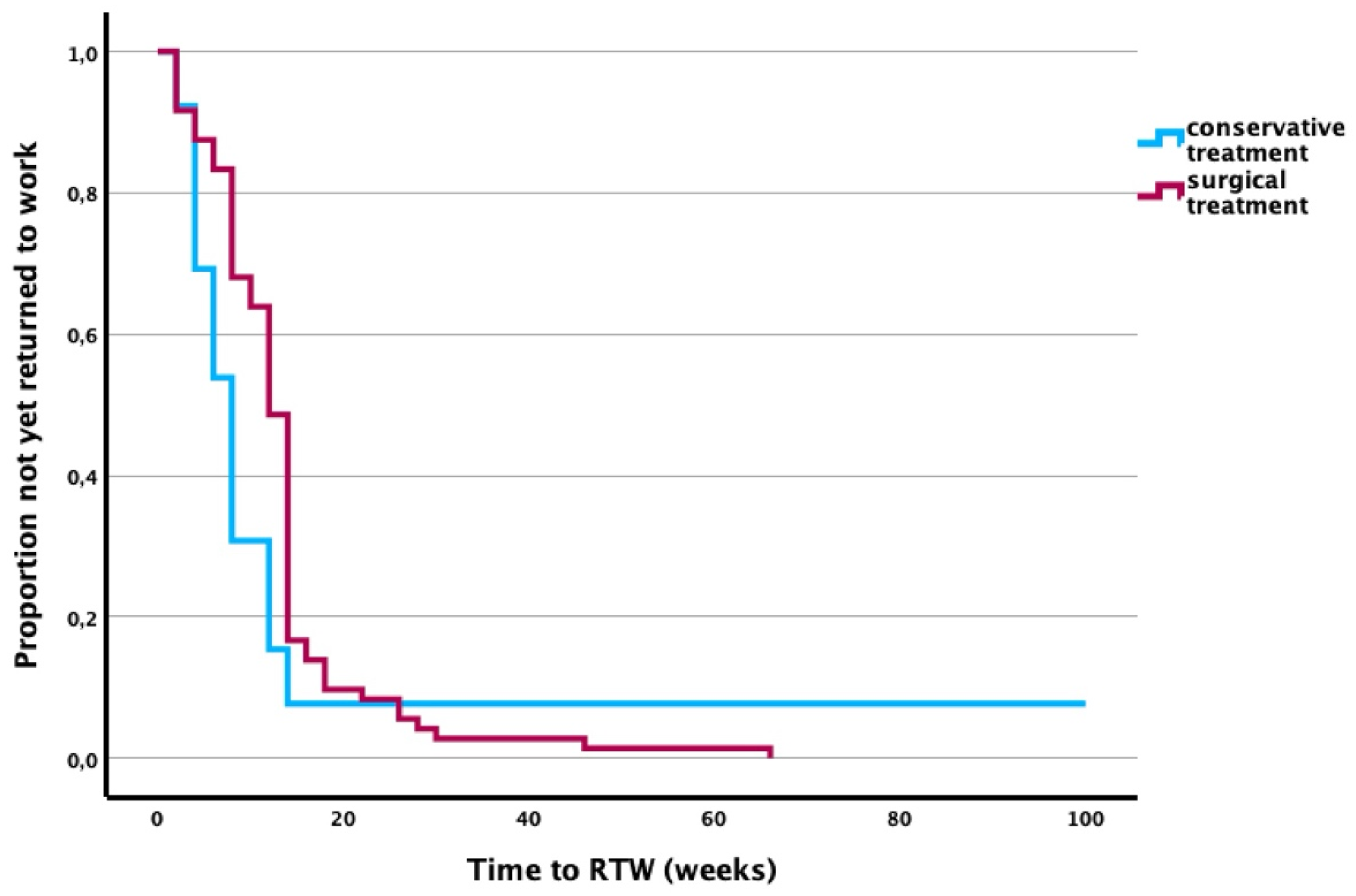 Patients categorized their previous occupation as “mostly sedentary”, “mostly standing and walking”, or “physically demanding”. The ability to return to the same job and the duration of work incapacity were assessed. RTW was defined as the time interval from injury (or surgery) to the resumption of work, either partially or fully.