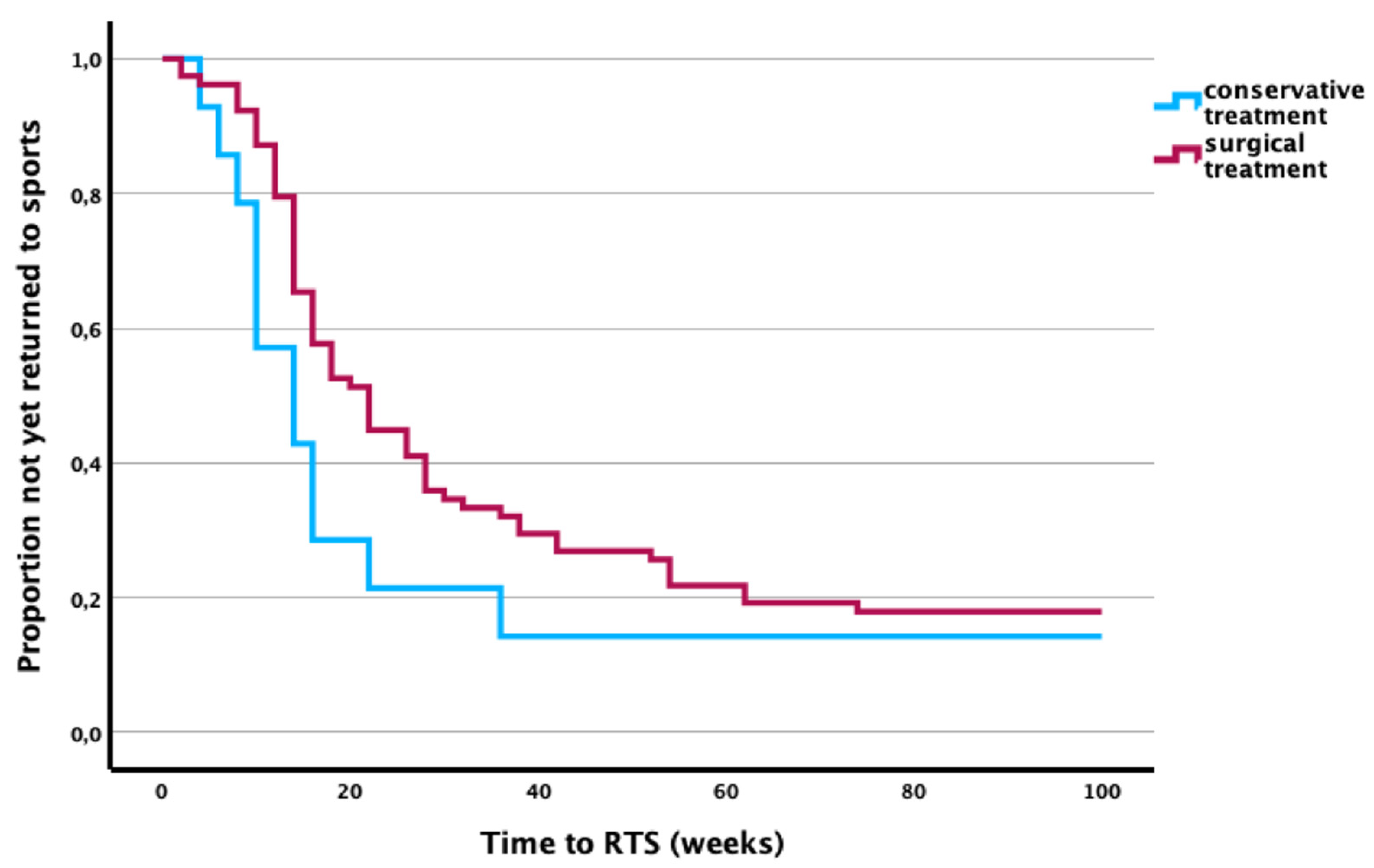 Similar to RTW, conservatively treated patients showed an earlier RTS compared to surgically treated patients, and we observed higher overall return rates and shorter return times than those reported in comparable literature. The factors previously discussed likely explain these findings here as well. In the context of RTS, a distinction is commonly made between return to participation, RTS, and return to performance [