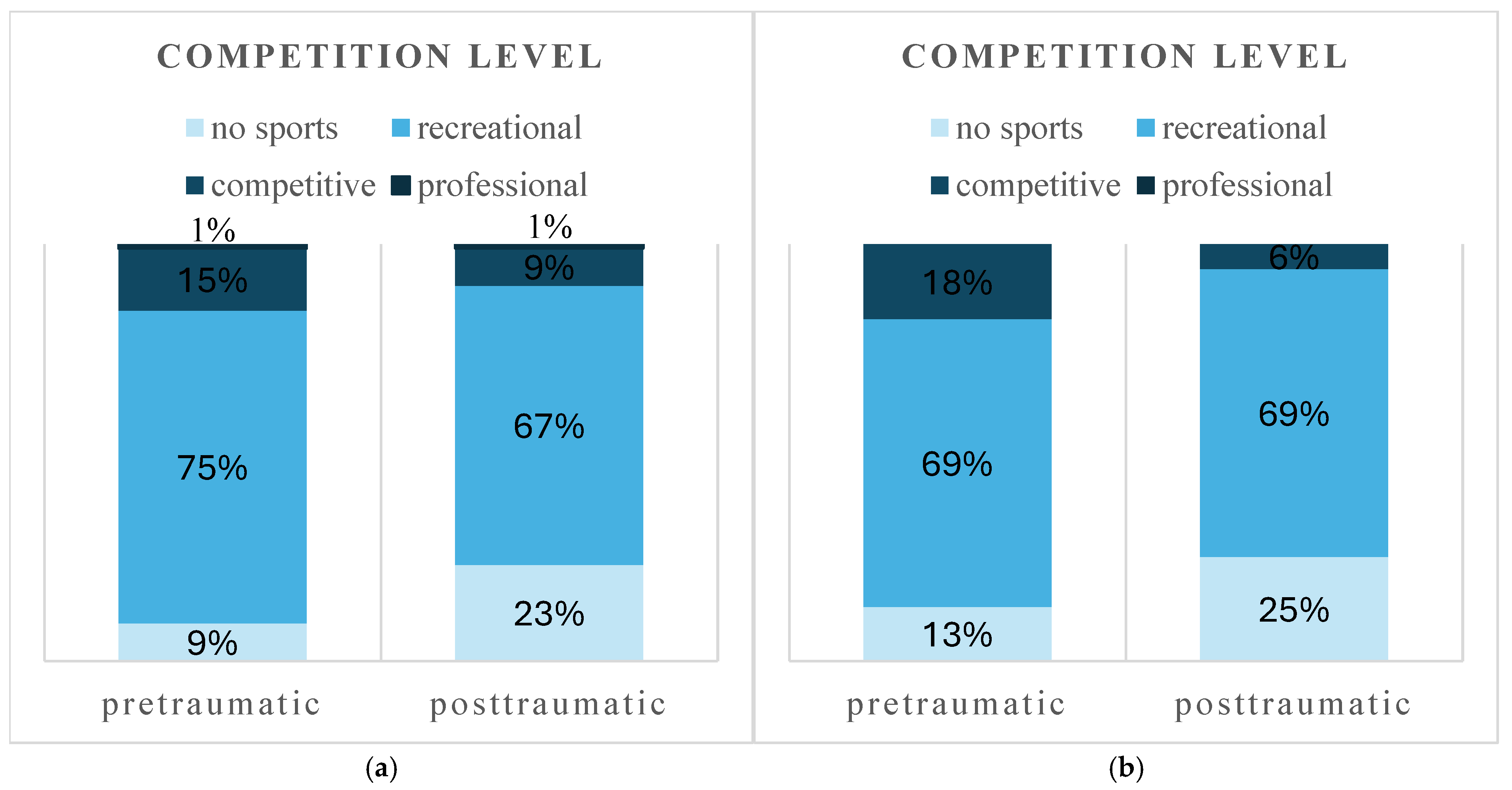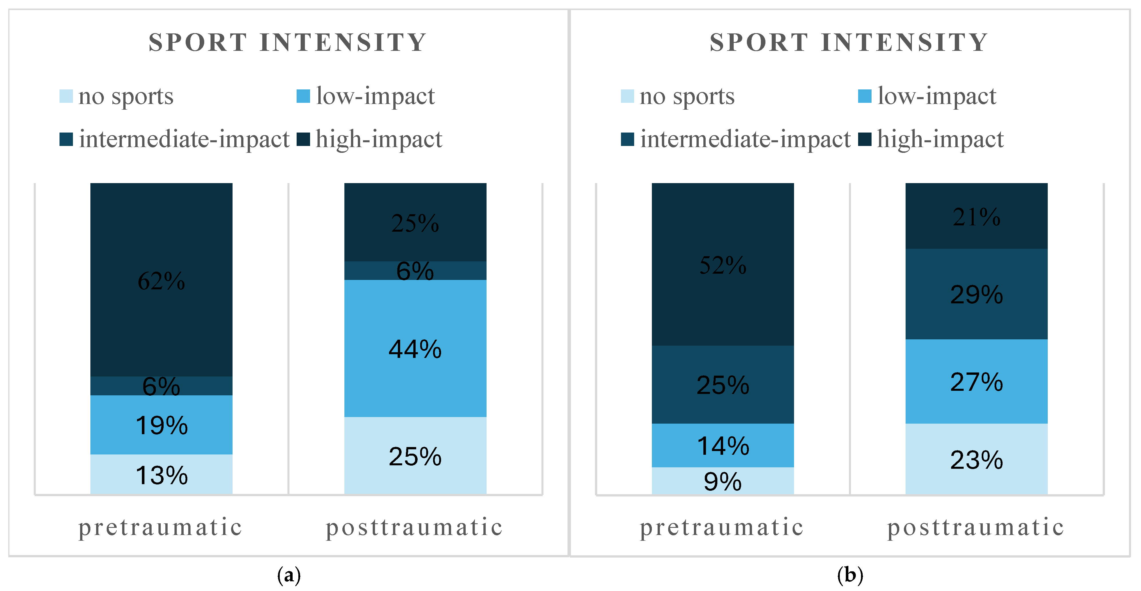 Regarding posttraumatic or postoperative sport intensity and competition level, the highest level reached after injury was recorded, rather than the current level at follow-up, due to the variable follow-up duration.