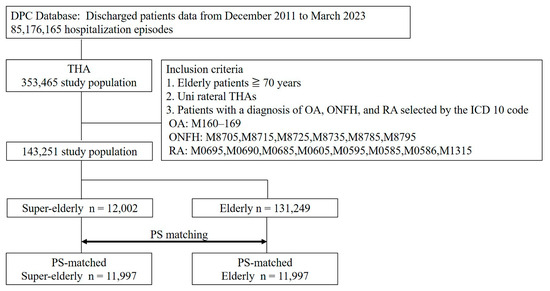 The sample size was defined by the predetermined study period, not by an a priori power analysis. Clinical data were collected from approximately 1100 hospitals participating in the DPC system across Japan, which continuously submitted data and authorized research use throughout the study period from December 2011 to March 2023. The analysis included patients who underwent unilateral total hip arthroplasty (THA) surgery at these hospitals across Japan. Focusing on patients aged 70 years or older, this clinical study assessed postoperative complications of THA, particularly contrasting outcomes between super-elderly individuals aged 85 or older (super-elderly group) and those aged 70 to 84 (elderly group). Patient’s diagnosis with most-medical resource were included based on ICD-10 codes: osteoarthritis (OA; M160–M169), osteonecrosis of the femoral head (ONFH; M8705, M8715, M8725, M8735, M8785, M8795), and rheumatoid arthritis (RA; M0695, M0690, M0685, M0605, M0595, M0585, M0586, M1315). We excluded patients who underwent revision THA, hemiarthroplasty, hip fracture surgery, bilateral procedures within the same hospitalization, or prior ipsilateral THA. Only elective primary unilateral THA cases were included.