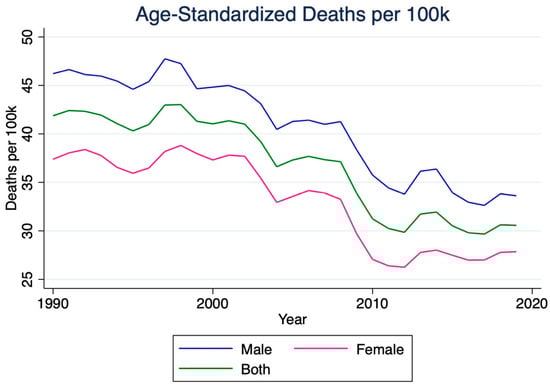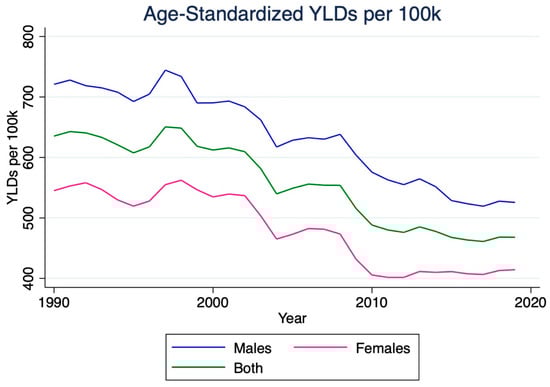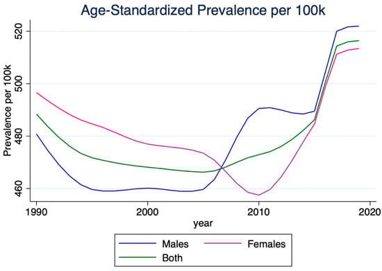 Age-standardized rates were calculated using the GBD standard population to enable temporal and sex-specific comparisons. Sex-based comparisons were derived directly from age-standardized rates reported by GBD 2019 []. Differences between sexes were interpreted using non-overlapping 95% uncertainty intervals, in accordance with established GBD methodology. All estimates were accompanied by 95% uncertainty intervals (UIs), derived from 1000 draws from the posterior distribution of each model to capture the uncertainty inherent in data inputs and modeling strategies.