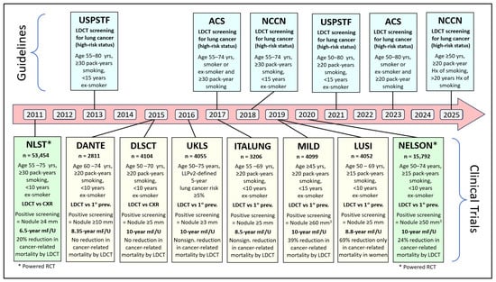 The United States Preventive Services Task Force (USPSTF) made a recommendation in 2013 for annual screening of lung cancer with LDCT in asymptomatic adults aged 55 to 80 years who have a 30 pack-year smoking history and currently smoke or have quit smoking within the past 15 years [27]. Similar recommendations were made after that by the American Cancer Society (ACS) and the National Comprehensive Cancer Network (NCCN) (Figure 1) [28,29]. Following NLST, six non-powered randomized clinical trials studied cancer-related mortality by LDCT screening (Figure 1) [30,31,32,33,34,35]. Four showed no or nonsignificant reduction in cancer-related mortality by LDCT screening [30,31,32,33,34,35], one showed a significant 39% reduction in all patients [34], and one showed significant reduction only in women [35] (Figure 1). Five trials identified high-risk populations using age and smoking status (Figure 1), while the UK Lung Cancer Screening Trial (UKLS) [32] used the Liverpool Lung Project version 2 (LLPv2) risk model criteria that define a 5-year lung cancer risk ≥5% in 50–75-year-old individuals [36] (Figure 1). In 2020, the NELSON trial randomized 15,792 subjects (age 55–75 years, ≥15 pack-years, <10 years ex-smoker) to have LDCT screening (at baseline, 1, 3, and 5 years) or no intervention. The study showed a 24% lung cancer-related mortality in the screening arm (HR = 0.76; p < 0.004) after 10-year follow-up [8] (Figure 1). A meta-analysis of all seven trials that used age and smoking status to identify high-risk populations to be screened by LDCT enrolled 84,558 participant patients with a smoking history of >15 pack-years and reported a significant 17% relative reduction in lung cancer mortality and a 4% reduction in all-cause mortality in the LDCT screening group compared with the control group [37]. Accordingly, LDCT has been recognized as the standard screening method for lung cancer in high-risk populations as defined by the updated guidelines of USPSTF, ACS, and NCCN (Figure 1) [22,38,39].