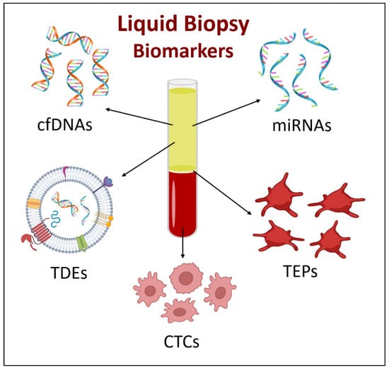 cfDNA = circulating cell-free DNA, CTCs = circulating tumor cells, ctDNA = circulating tumor DNA, miRNA = microRNA molecules, TDEs = tumor-derived exosomes, TEPs = tumor-educated platelets.