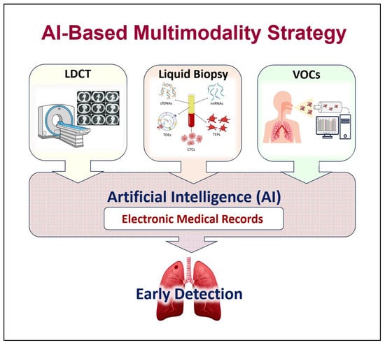 Recently, the ASCEND-LUNG trial, a prospective multimodality study, integrated a multi-omics liquid biopsy-based model formed on cfDNA methylation and protein features for early lung cancer screening and AI-aided LDCT analysis to discriminate between benign and malignant pulmonary nodules. The study highlighted the success and validation of the integrated system that was developed, which might provide a potentially applicable solution for early lung cancer detection [241]. AI-based multimodality models have gained more attention recently as they could revolutionize early lung cancer screening, especially if combined with clinical information (smoking history and other risk factors) [242,243].