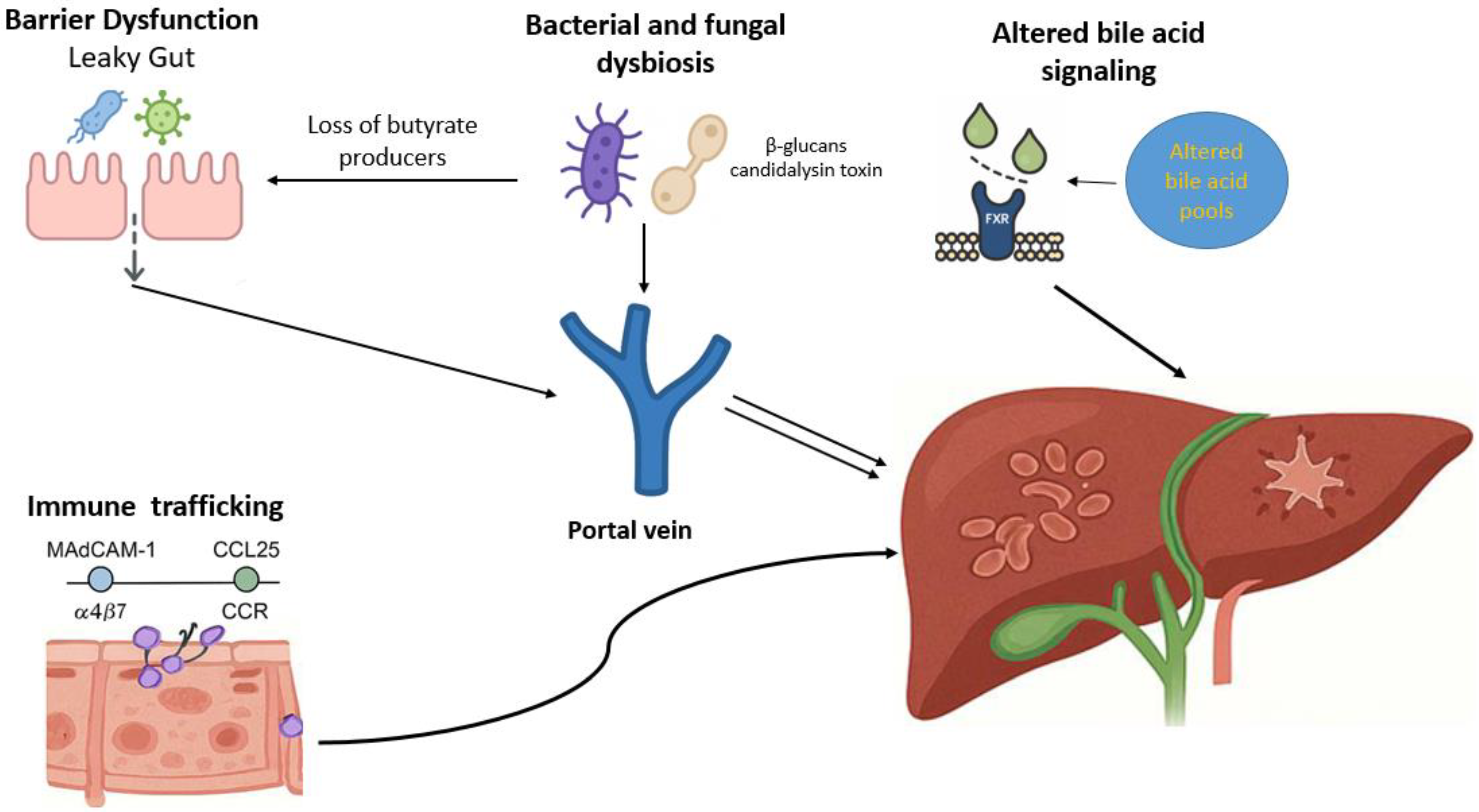 | Gut-primed lymphocytes and B cells migrate to the liver via mucosal adhesion pathways, sustaining chronic biliary inflammation and immune-mediated injury | [51,52,55,56,57] |