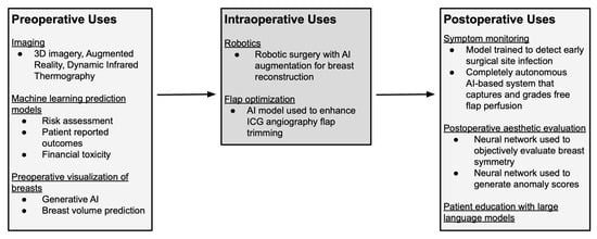 Breast reconstruction is an important aspect of breast cancer care, with effects on both physical recovery and psychological well-being following mastectomy []. Over the past decade, AI has been incorporated into multiple stages of reconstructive care, including preoperative image assessment, risk assessment, and patient-reported outcome prediction [,] (See Table 1 and Figure 2). More recently, the emergence of conversational AI chatbots has prompted investigations into the accuracy and quality of AI-generated medical guidance []. As technological capabilities continue to expand, it is essential to examine how plastic and reconstructive surgery can evolve in parallel with these innovations.