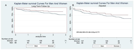 (A): Unadjusted and (B): Adjusted Kaplan–Meier survival curves for men and women, showing that sex was not a predictor of mortality.