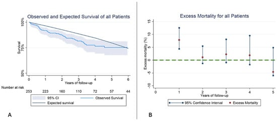 (A): Kaplan–Meier observed survival (OS) and expected survival (ES) of all patients. The reference population’s ES is greater than our sample’s OS. (B): Excess mortality (EM) for all patients. In the first year of follow-up the EM is higher than the reference population, but in the following years, EM stays similar.