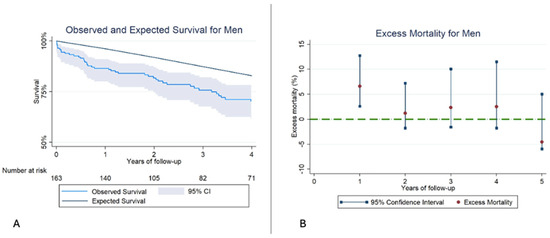 (A): Kaplan–Meier observed survival (OS) and expected survival (ES) for Men. The ES of the reference population remains above the OS of our sample. (B): Excess mortality (EM) for men. The EM remains high during the first year, reaching similar levels in the subsequent years of follow-up.