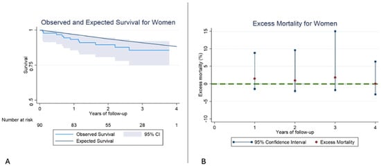 (A): Kaplan–Meier observed survival (OS) and expected survival (ES) for women. In this case, the ES falls within the 95% confidence interval, and therefore, no differences exist between the OS of our sample and the ES of the reference population. (B): Excess mortality (EM) for women. In this case, there are no significant differences in EM in any of the years of follow-up.