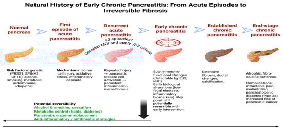 The natural history of CP is increasingly recognized as a continuum, starting from acute episodes and recurrent attacks, progressing through early morpho-functional changes, and eventually leading to irreversible fibrosis and end-stage disease. To illustrate this conceptual framework, Figure 1 summarizes the stepwise transition from AP to CP, highlighting potential windows for intervention and reversibility.