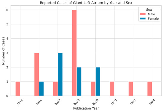Temporal and Sex Distribution of Reported Giant Left Atrium Cases (2015–2024).