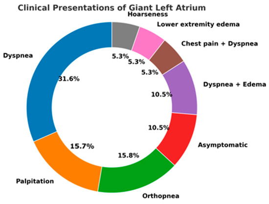 Compressive symptoms, although less frequent, carried particular diagnostic value. Dysphagia, stridor, and hoarseness were reported in a minority of patients, but they represented clear markers of extreme atrial enlargement with direct mechanical impact on adjacent structures [24,29]. Figure 3 illustrates the distribution of compressive and cardiorespiratory symptoms reported in the reviewed cases. These atypical presentations are of special interest, as they may lead to delayed recognition if not correlated with cardiac imaging [4,27].