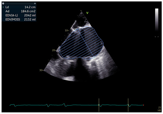 Transthoracic echocardiography showed a severely dilated left atrium, measuring 10.3 cm in diameter with an estimated volume of approximately 2000 mL (as shown in Figure 6). The left ventricle was dilated and hypertrophied, globally hypokinetic, with a reduced ejection fraction of 35–40%. The mitral mechanical prosthesis and tricuspid bioprosthesis were both normally functioning, with only mild intraprosthetic tricuspid regurgitation. Degenerative aortic regurgitation of moderate severity was also present. The right ventricle was dilated with systolic dysfunction and reduced TAPSE, while pulmonary artery pressures were severely elevated but could not be precisely quantified.