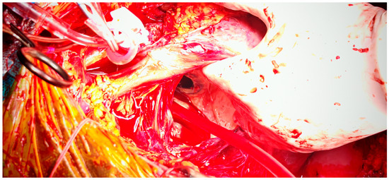 Postoperatively, the patient remained in critical condition, intubated, and dependent on maximal inotropic and vasopressor support. Early echocardiography showed compression of the right-sided cardiac chambers with features of impending collapse. Preoperative laboratory parameters, including coagulation profile, were within acceptable limits and consistent with a compensated clinical status, while postoperative deterioration reflected the onset of acute hemodynamic compromise. The associated coagulation disorders, secondary to hepatic dysfunction, further amplified the hemodynamic instability and contributed to the unfavorable evolution of the physiopathological cascade. Emergency re-exploration revealed hemopericardium with tamponade, which was evacuated with surgical drainage. Perioperative anticoagulation was adjusted and monitored according to institutional protocols, but the patient’s condition remained unstable despite maximal supportive therapy. He subsequently suffered an irreversible cardiac arrest due to electromechanical dissociation, unresponsive to advanced resuscitation.