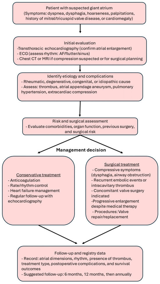 To translate current evidence into practical clinical guidance, we propose a simplified diagnostic and management algorithm (Figure 10). This flowchart outlines the recommended pathway for evaluating patients with suspected giant atrial dilatation, beginning with echocardiographic confirmation and extending to etiologic assessment, risk stratification, and individualized treatment selection. Conservative management is appropriate for stable or high-risk patients without compressive symptoms, while surgery should be considered in those with compressive or embolic complications, concomitant valve disease, or progressive enlargement despite optimal medical therapy. The final step emphasizes structured follow-up and standardized data recording—such as atrial dimensions, rhythm status, treatment type, and outcomes—to facilitate future registry-based research and improve comparability across studies.