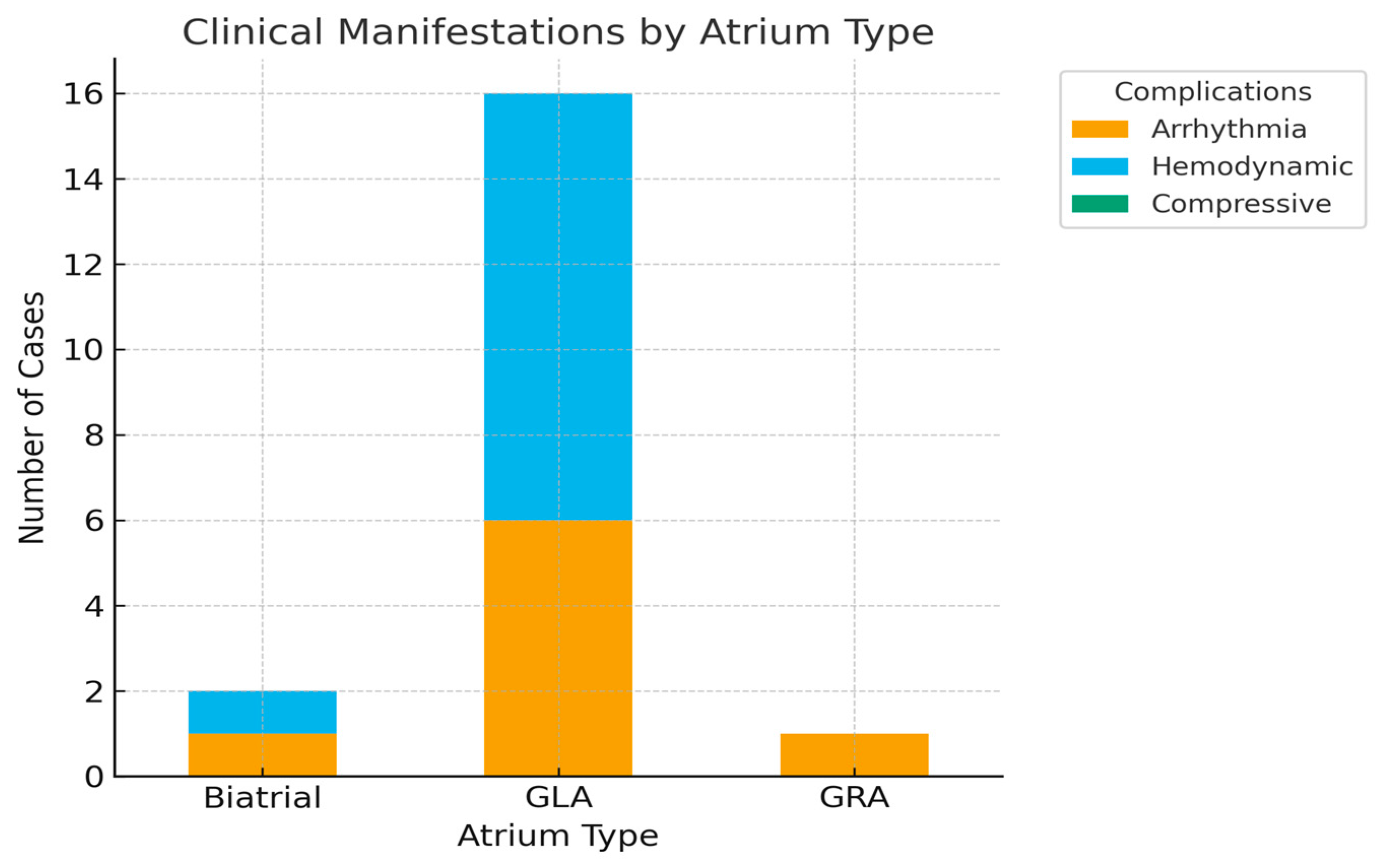 | Journal | Year | Age | Sex | Symptoms | Comorbidities | Diagnostic | Supplementary Diagnostic | Cardiac Surgery Before | Diameter Atrium | Biatrial Dilatation | Appendage Aneurysm? | LVEF | Pulmonary Artery Hypertension | Present Thromb? | Arrythmia | Treatment | Cardiac Surgery Concomitant | Complication | Outcome |