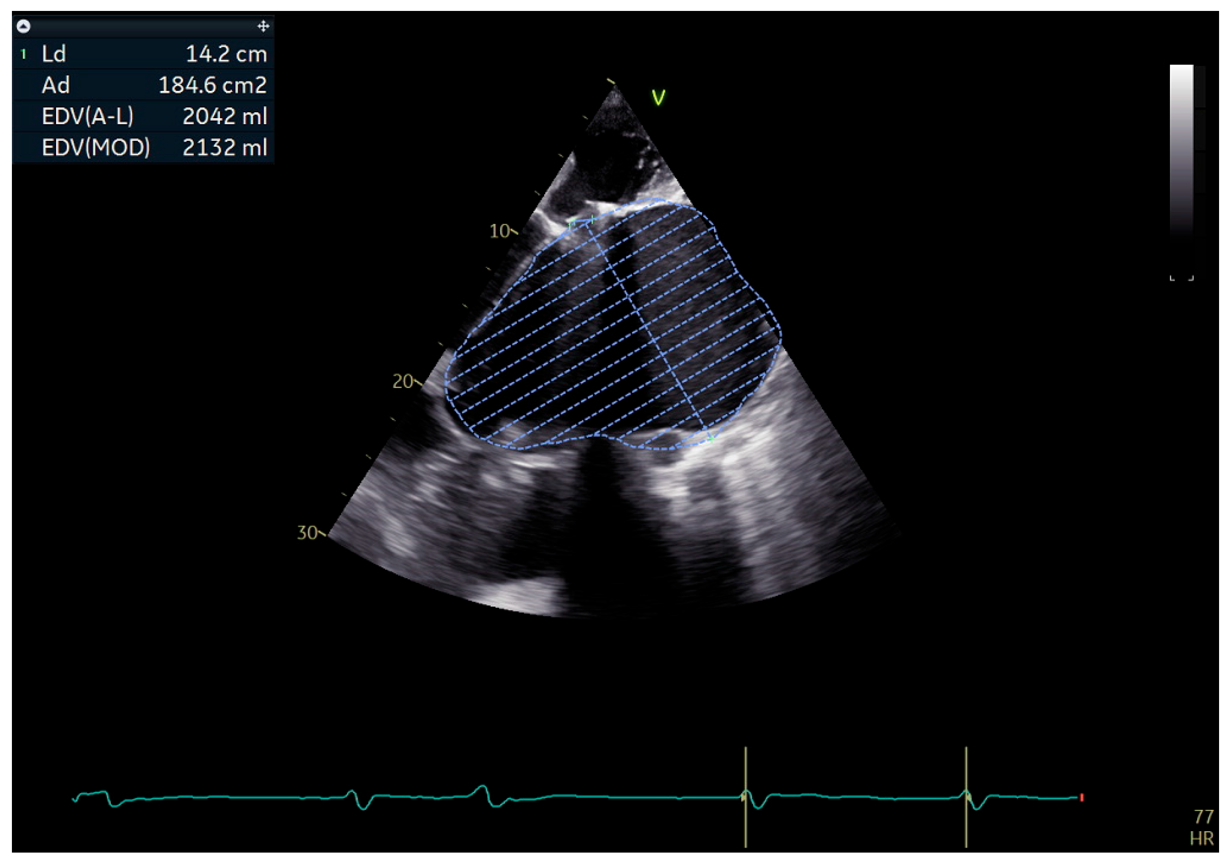 - Borizanova, A.; Kinova, E.; Getsov, P.; Goudev, A. Giant Left Atrium in an Octogenarian with a Complex Etiology. Balk. Med. J. 2024, 41, 226–227. [Google Scholar] [CrossRef]