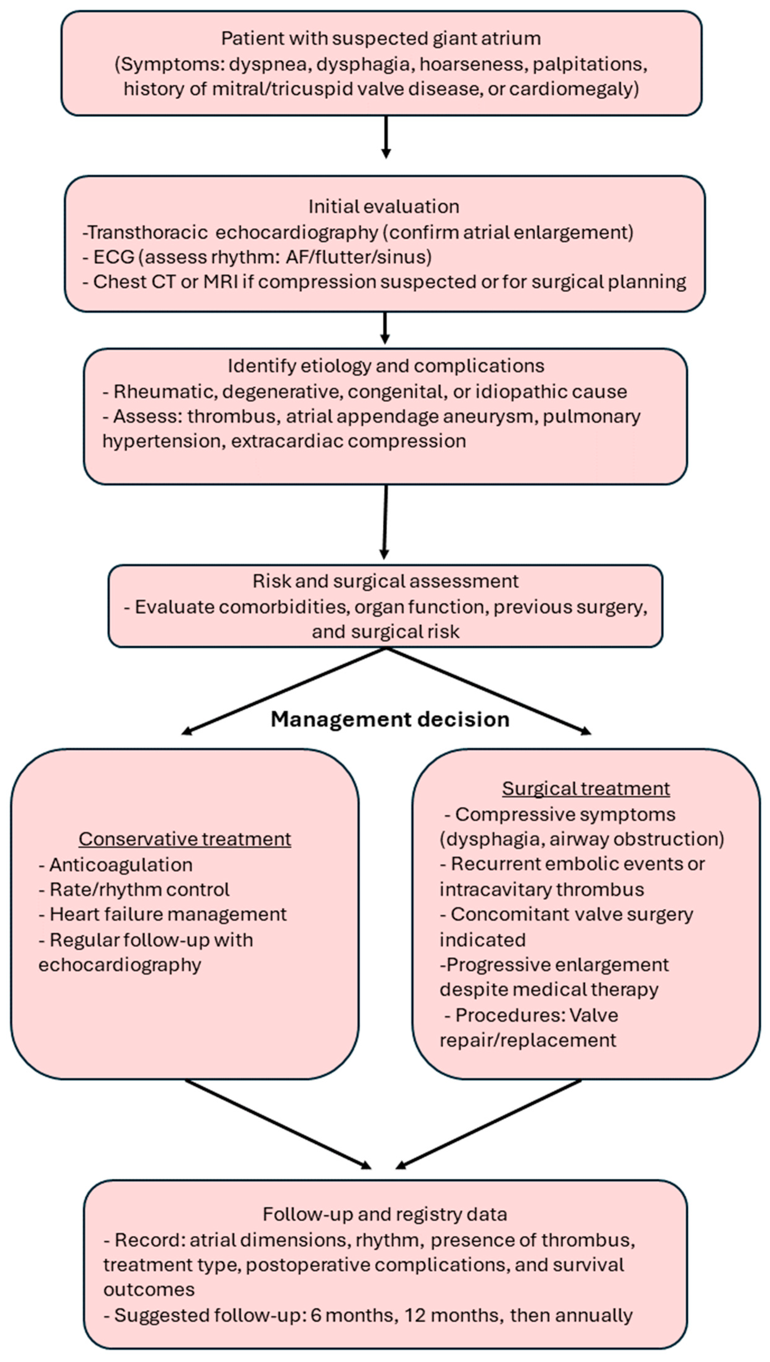 - Tan, J.L.; Thakur, K.; Finkel, J. Giant Left Atrium: Look before You Leap into Invasive Procedures. BMJ Case Rep. 2018, 2018, bcr2018224777. [Google Scholar] [CrossRef] [PubMed]