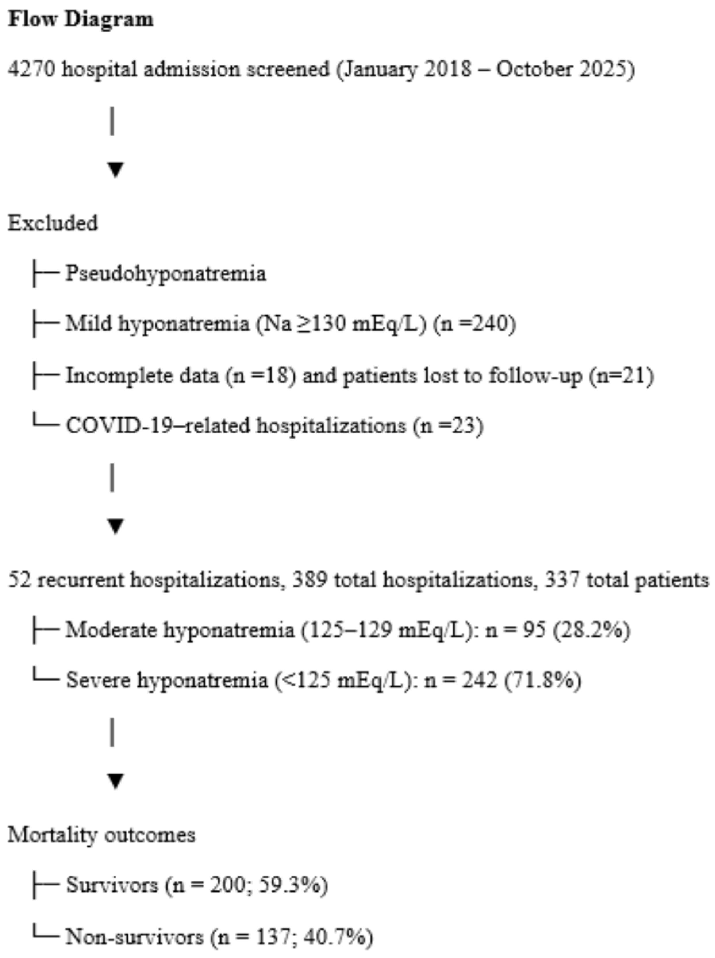 - Singh, P.; Arora, S.; Singh, D.; Kalra, S.; Singh, A.; Arora, U.; Mittal, N.; Goyal, M.K.; Kaur, S.; Kalra, E. Hyponatremia and outcome: Is severity more important than etiology? Cureus 2023, 15, e42808. [Google Scholar] [CrossRef]