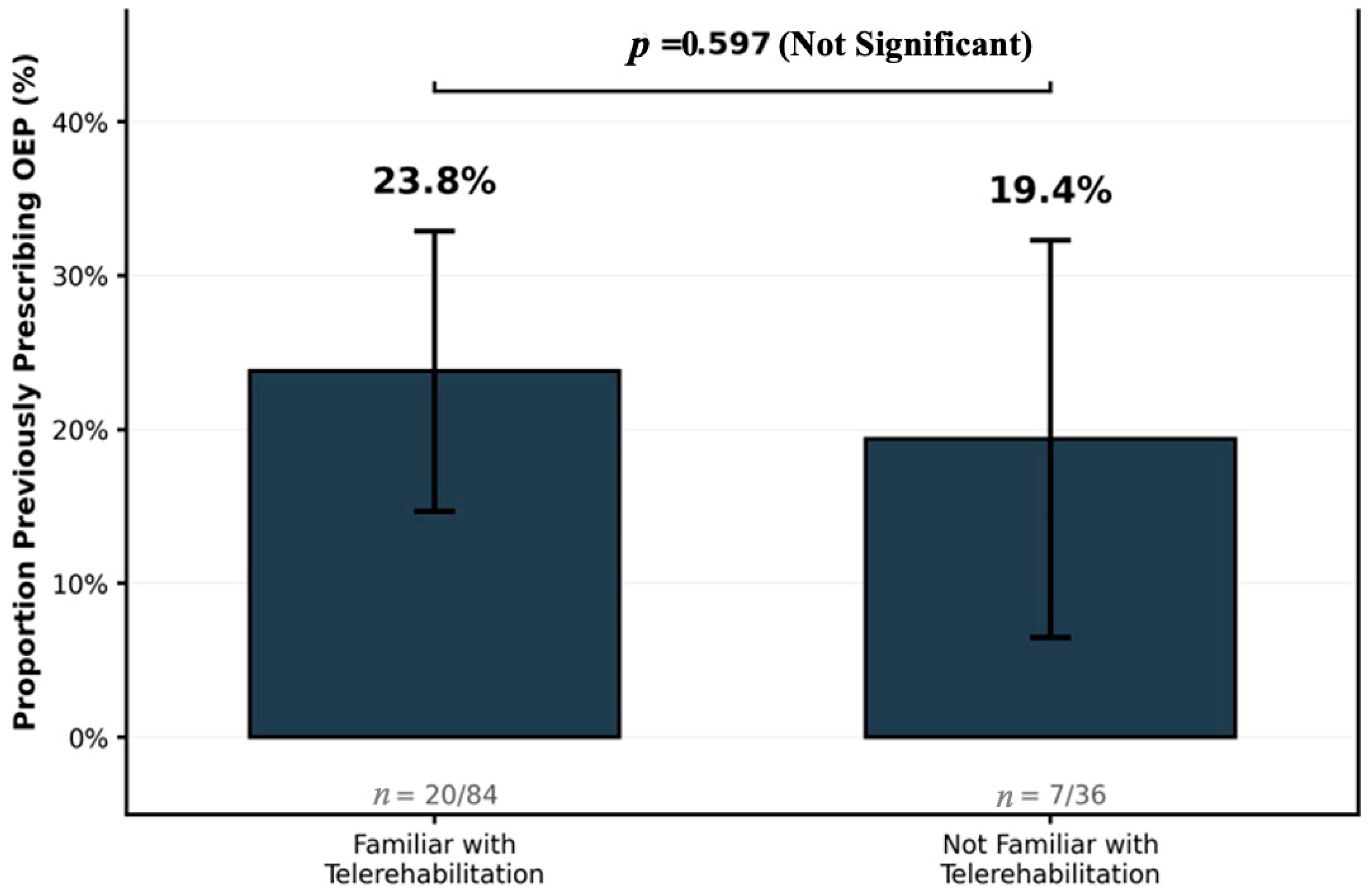 Awareness campaigns are insufficient to increase the implementation of OEP via telerehabilitation. Clinicians and service leaders should prioritize competency-based training aligned with the APTA telerehabilitation guidelines, covering remote assessment workflows, exercise progression and safety, documentation standards, emergency procedures, and outcome evaluation [