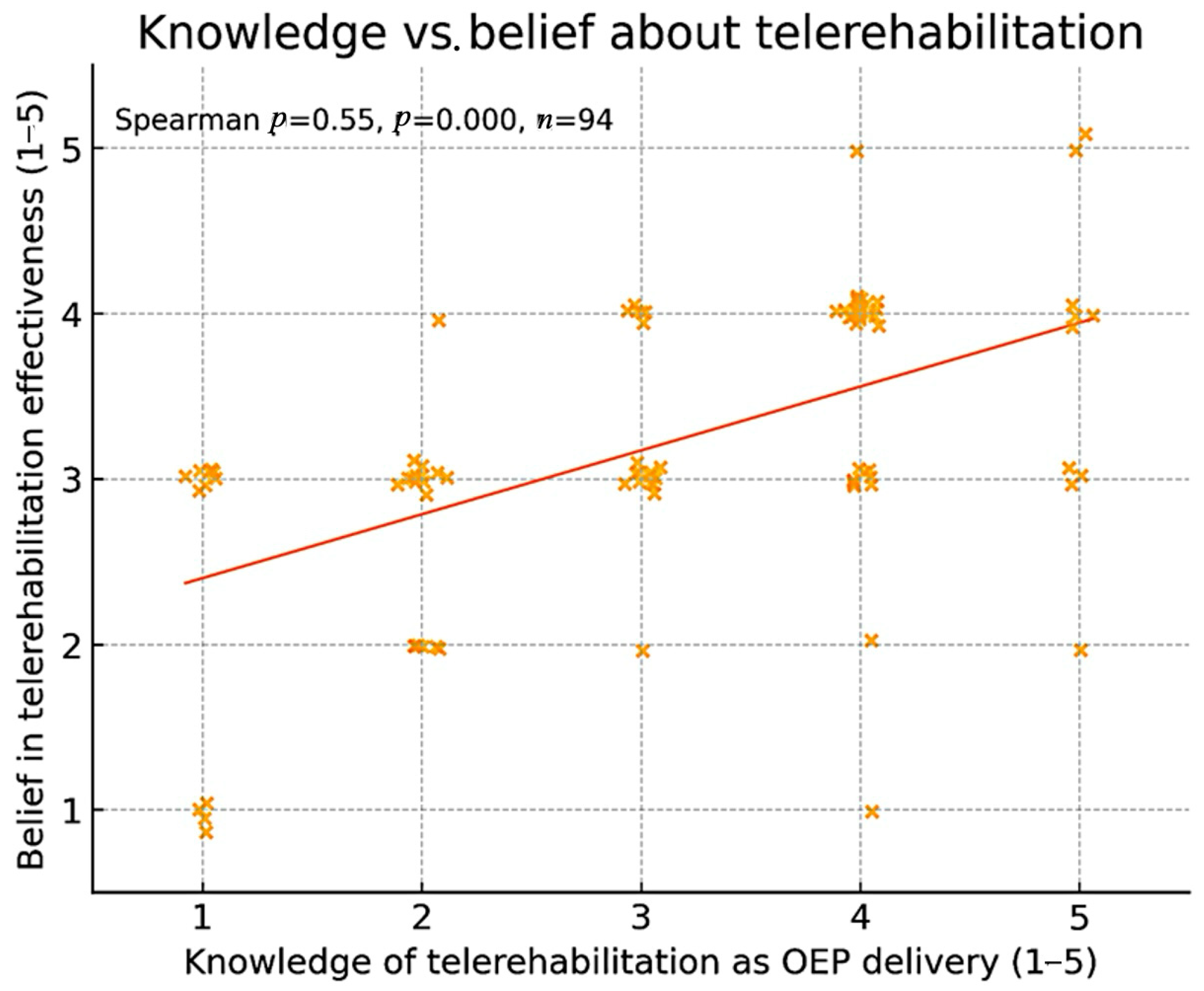 Belief that telerehabilitation can effectively deliver the OEP (Performance Expectancy): single 5-point Likert item (higher = stronger belief), analyzed with ordinal logistic regression.