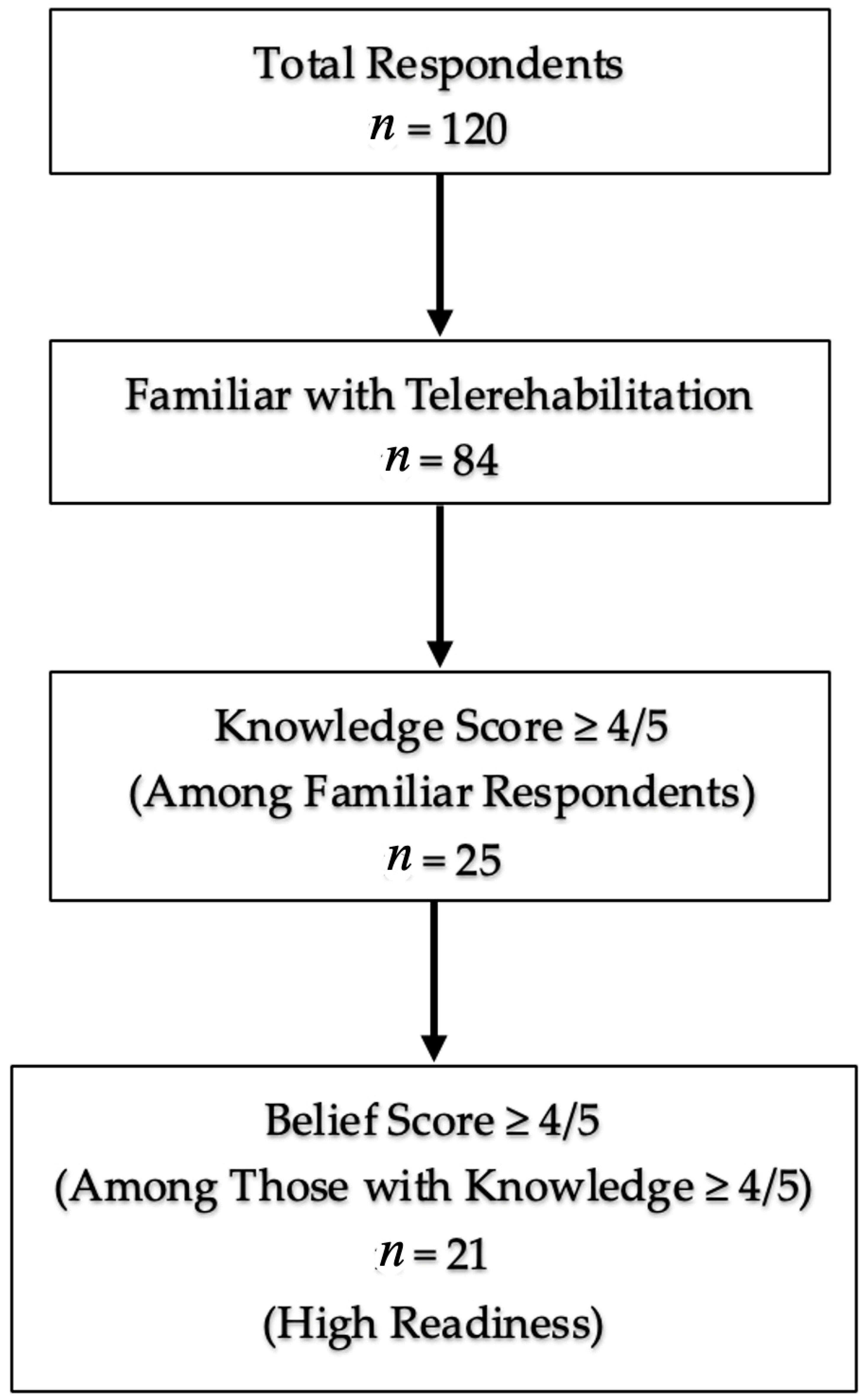 “High telerehabilitation readiness” required the fulfillment of the following three criteria: (i) familiarity with telerehabilitation, (ii) knowledge ≥ 4/5, and (iii) belief ≥ 4/5. This conjunctive threshold reflects implementation practice, in which exposure and favorable appraisal are prerequisites for safe clinical deployment. To mitigate circularity, the primary readiness model excluded knowledge and belief as predictors (anti-tautology rule). As secondary, exploratory specifications, we evaluated models that included knowledge and belief and a “two-of-three” readiness threshold; qualitative inferences were unchanged.