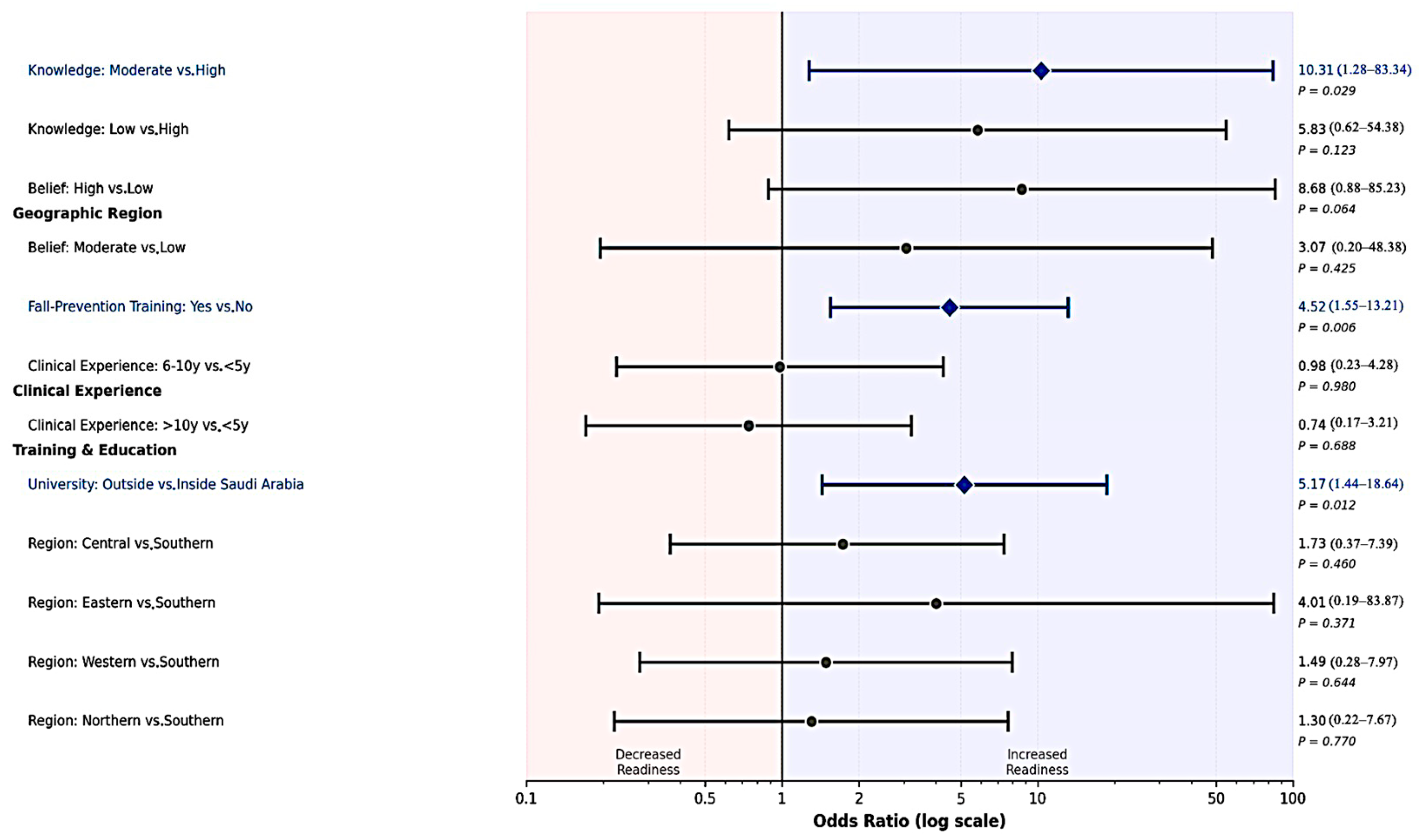 Supplementary Material S1, Table S1. As reported in the Results and Supplement, training and education outside Saudi Arabia remained statistically significant with directionally consistent magnitudes (for example, Firth: training OR = 3.74; university outside OR = 4.15; no-pilot: training OR = 4.85; university outside OR = 5.35), supporting robustness to small-event bias and pilot inclusion.