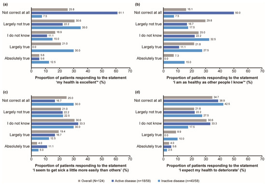 | The COVID-19 pandemic puts more strain on me as an AOSD patient than on other healthy people and further restricts my quality of life | 42 (33.9) | 82 (66.1) |