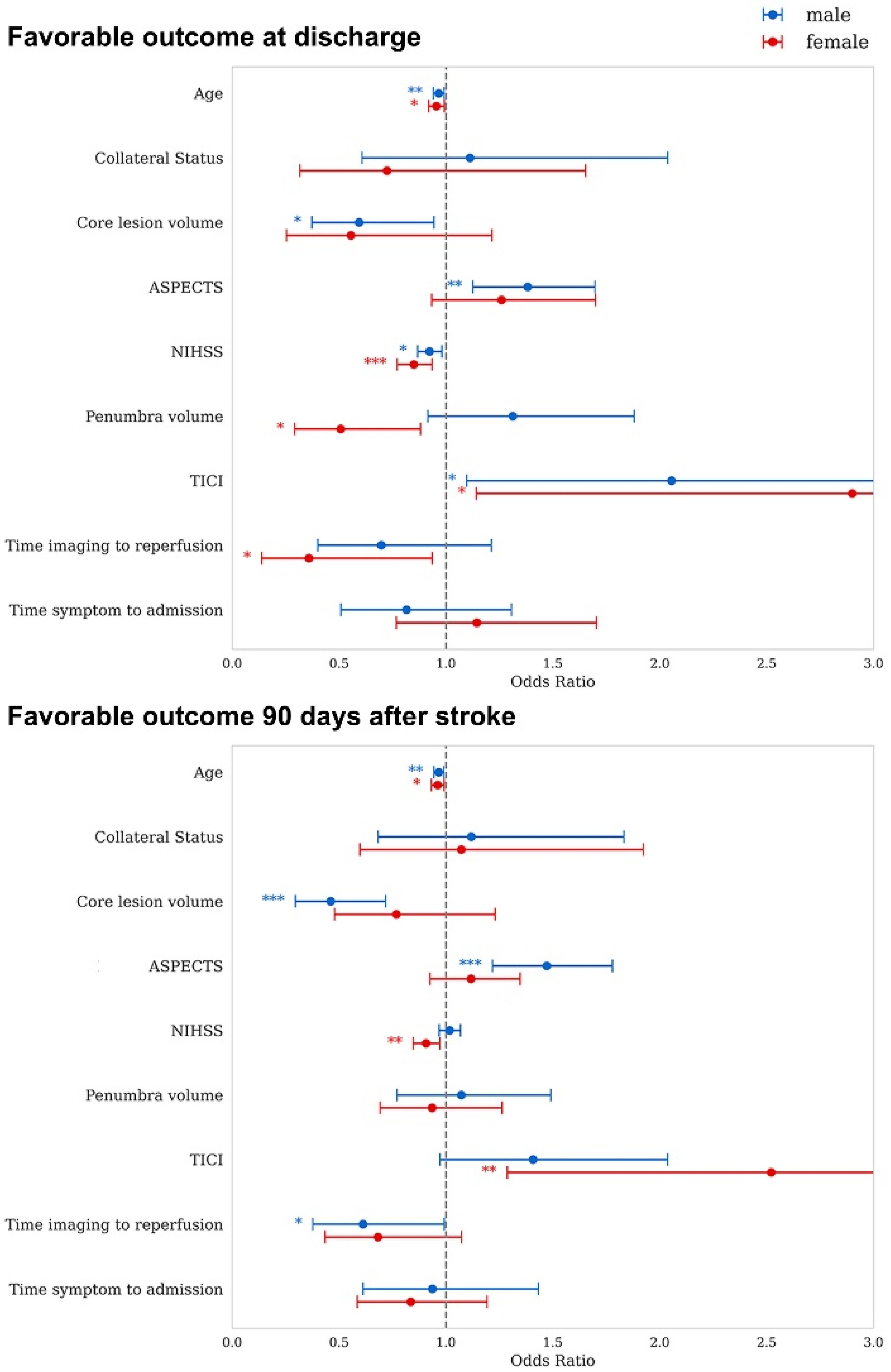 Figure 2. Forest plots showing sex-dependent associations of prognostic markers and outcome. Odds Ratios above 1 indicate that higher values are linked to a greater likelihood of favorable outcome. Asterisks mark significant associations (* p < 0.05; ** p < 0.01; *** p < 0.001). Red lines indicate the odds ratio and statistical significance of the respective prognostic marker for women; for men, these are shown in blue.