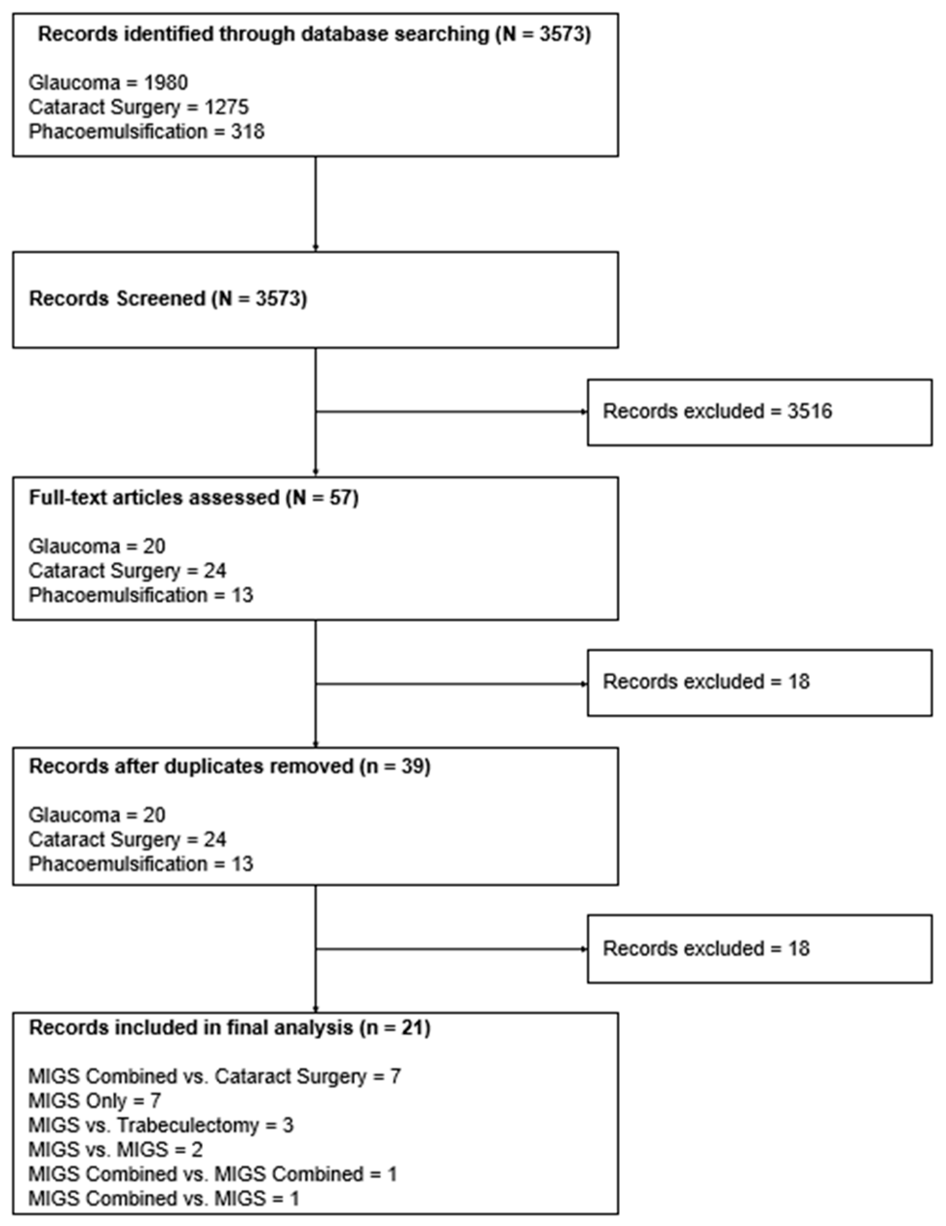 A total of 3573 records were exported and screened from ClinicalTrials.Gov using the search strategy described above. At the end of the process, 21 clinical trials were identified and included in the analysis, which comprised 3330 participants. Seven trials compared MIGS and cataract surgery with cataract surgery alone, one trial compared MIGS and cataract surgery with MIGS and cataract surgery, one trial compared MIGS and cataract surgery with MIGS alone, two trials compared MIGS with MIGS, three trials compared MIGS with trabeculectomy, and seven trials studied MIGS alone. Figure 2 further details the included studies with a PRISMA diagram.