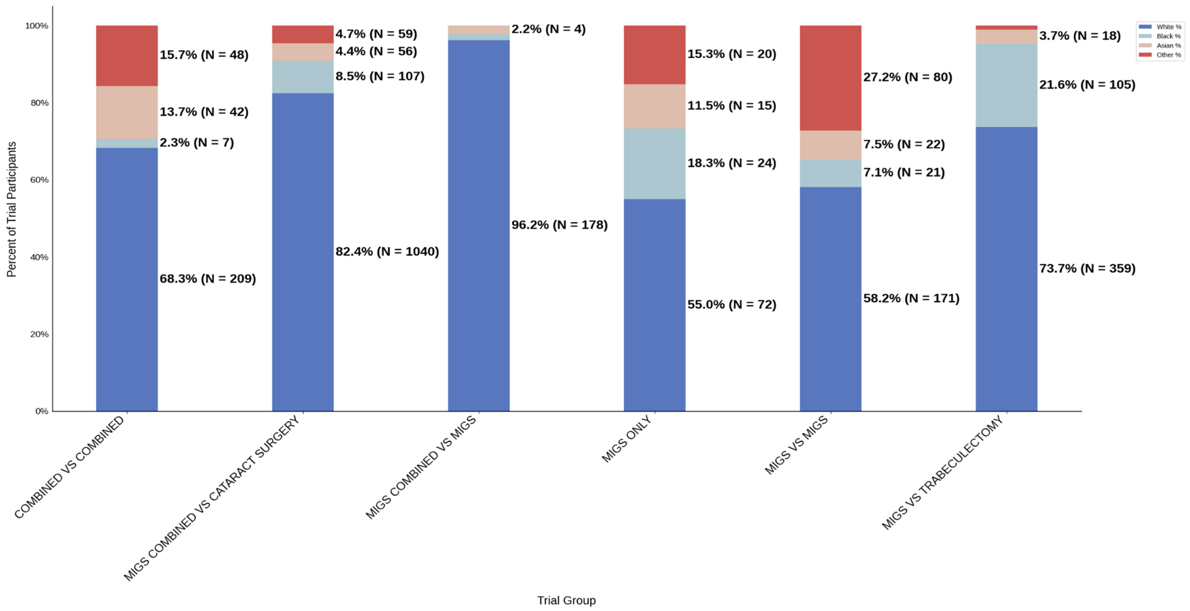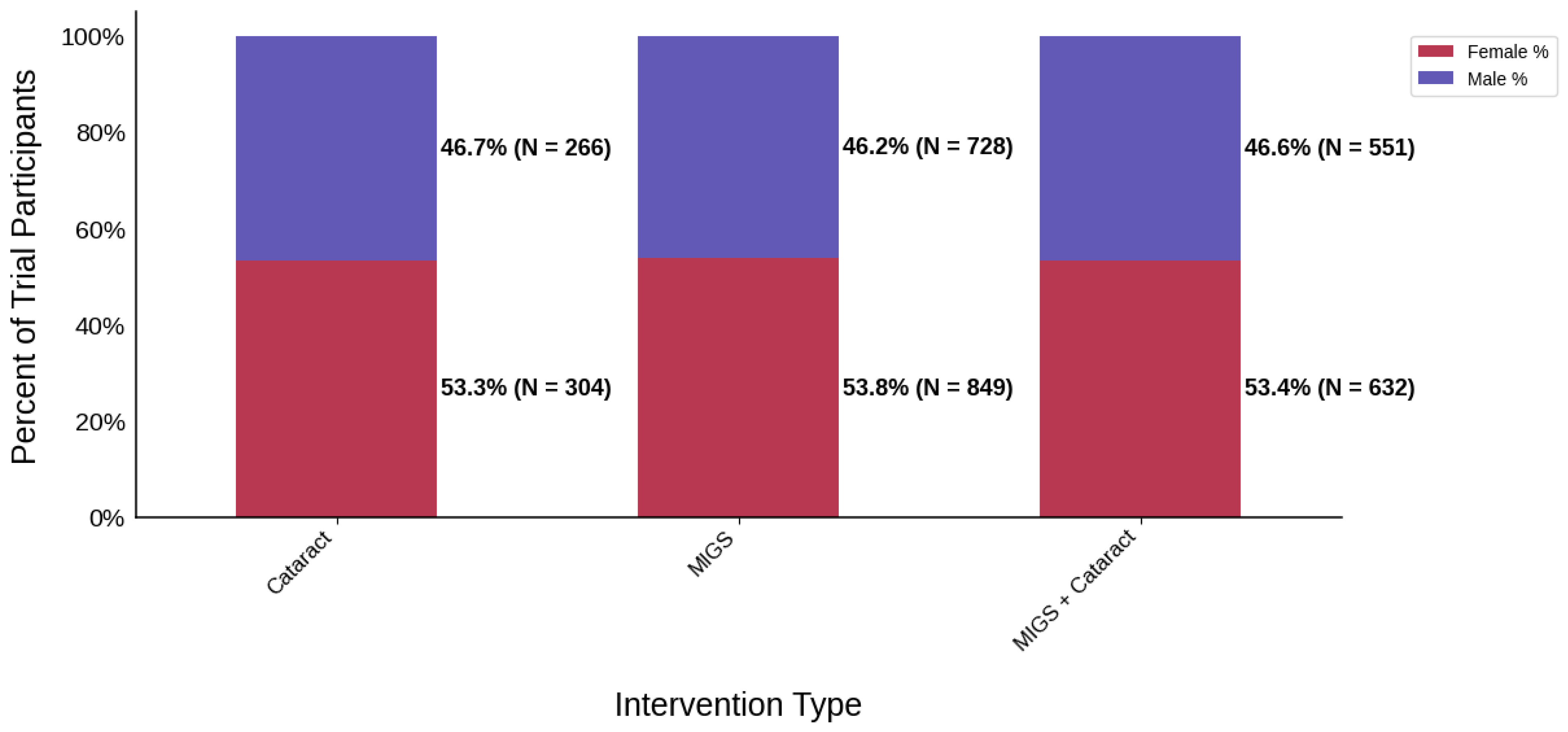 Trial Type: MIGS vs. trabeculectomy trials had the highest rate of Black participation (21.6%), while MIGS combined vs. MIGS trials had the lowest (1.6%). Female participation remained relatively balanced across trial types, with the exception of lower representation in the combined vs. combined cohort (51.3%).