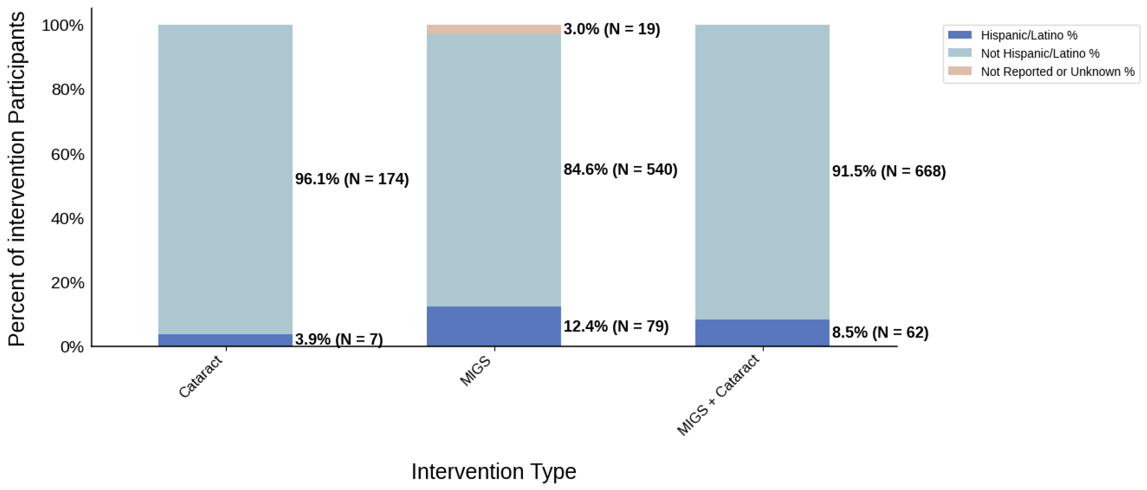 Intervention Type: The highest rate of Black participation was in MIGS trials (14.2%), while cataract surgery trials had lower representation (5.8%). Hispanic/Latino participation was highest in MIGS trials (12.4%) and lowest in cataract surgery trials (3.9%).