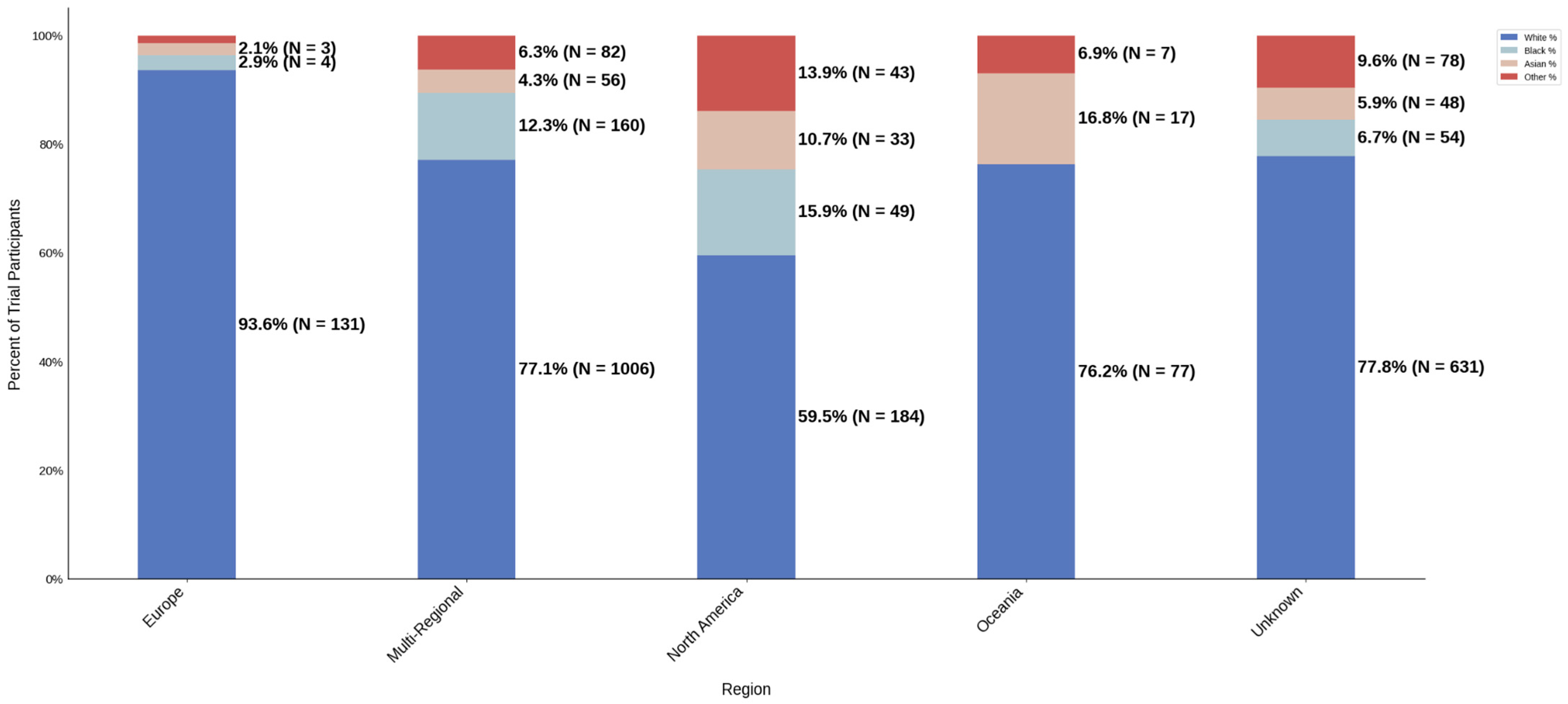 Region: Black participation was lowest in Oceania (0.0%) and Europe (2.9%). Female participation was also lowest in Oceania (32.7%). North America and multi-regional studies demonstrated greater racial diversity, but Black participants remained under-represented.