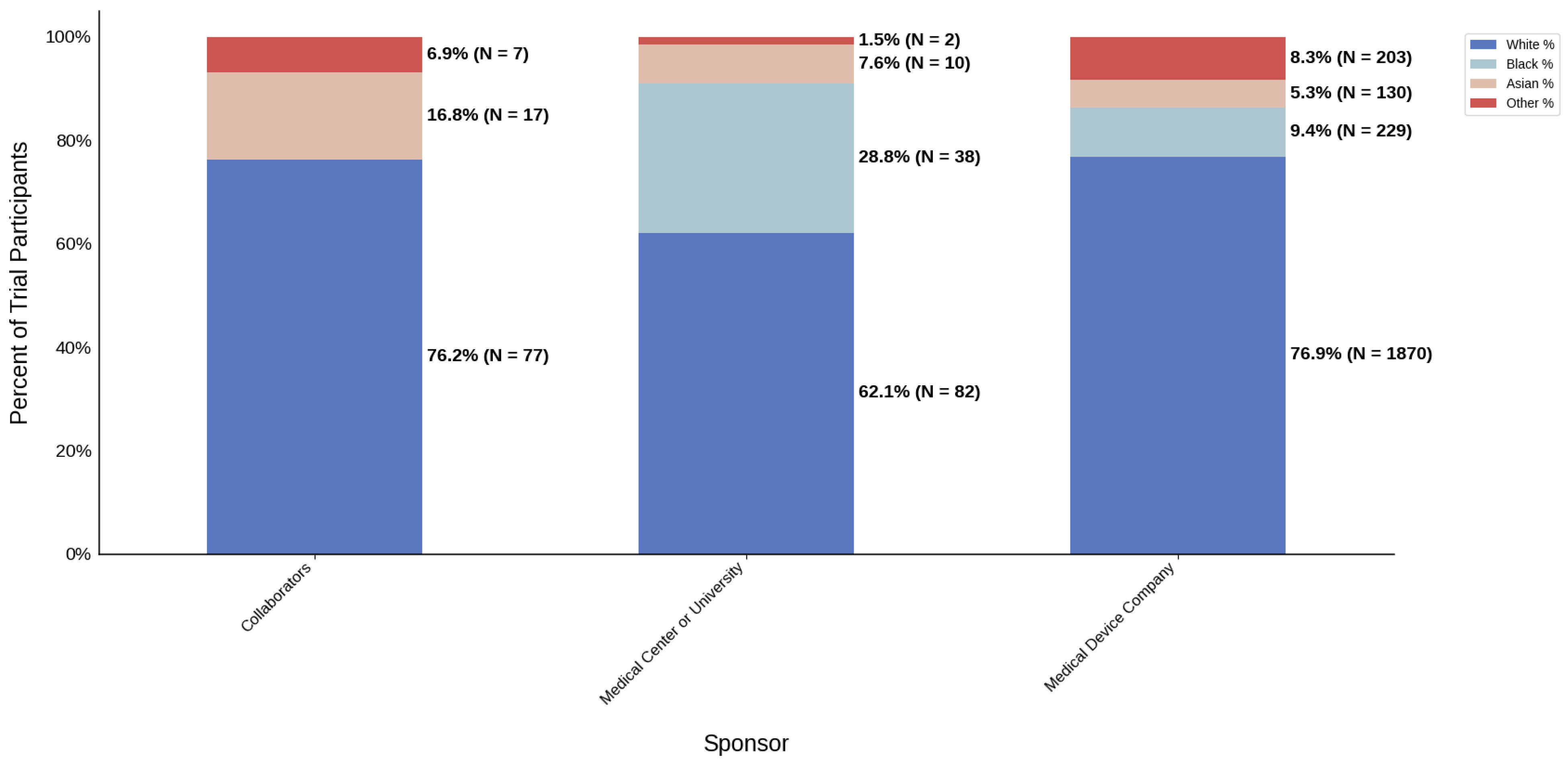 Figure 18 displays the distribution of participants by sex, and Figure 19 highlights the female PPR by sponsor type. Medical device companies had the highest female participation rate at 54.5% (N = 1668). Medical centers and universities had a rate of 46.2% (N = 61). Females were under-represented in the collaborators cohort with a PPR of 0.761. Figure 20 presents the distribution of participants by race, and Figure 21 shows the Black PPR by sponsor type. In the medical center or university group, the participation of Black individuals was 28.8% (N = 38), while medical device companies had a participation rate of 7.5% (N = 229). PPR suggests that Black participants were over-represented in the medical center or university cohort, while the other sponsor types had under-representation. Figure 22 exhibits the ethnic distribution of participants. Only medical-device-sponsored trials reported ethnicity, with Hispanic/Latinos comprising 9.6% of participants. Table 7 summarizes the trial participation rate by each subgroup and sponsor type, as well as the female and black PPR.