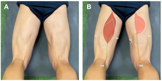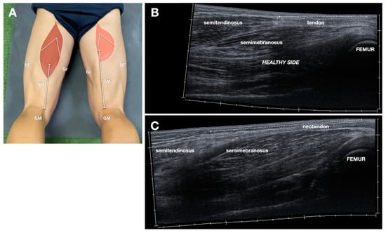 Tendon regeneration following semitendinosus (ST) harvesting for anterior cruciate ligament (ACL) reconstruction remains a widely debated topic in the literature []. Several studies have reported the potential for partial or complete regrowth of the ST tendon, with variable structural organization and biomechanical functionality (Figure 1) [,,,]. One of the most critical issues is whether this “neo-tendon” (NT) can restore the biomechanical characteristics of the native tendon and how this influences the function of the ST muscle []. Prior studies have highlighted substantial variability in regeneration quality, with findings that include muscle hypotrophy, changes at the myotendinous junction (MTJ), and reduced NT gliding compared to the healthy contralateral side [,,,]. However, a study that evaluates extensively the morphology and dynamic behavior of the ST muscle–tendon unit is lacking, underscoring the need for further investigation.