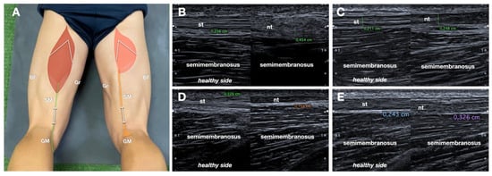 Neotendon thickness and echostructure in different patients. (A) Schematic drawing (same as Figure 1B, refer to it for the abbreviations) indicating probe position. (B–E) Longitudinal comparative sonograms at the distal third of the thigh demonstrate the neotendon thickness (indicated in cm, measured also on the healthy side) and echostructure. (B) Iso-hyperechoic, non-fibrillar. (C) Hypoechoic, non-fibrillar. (D) Hypoechoic, fibrillar-like. (E) Iso-hyperechoic, fibrillar-like. nt indicates the neotendon; st, semitendinosus tendon.