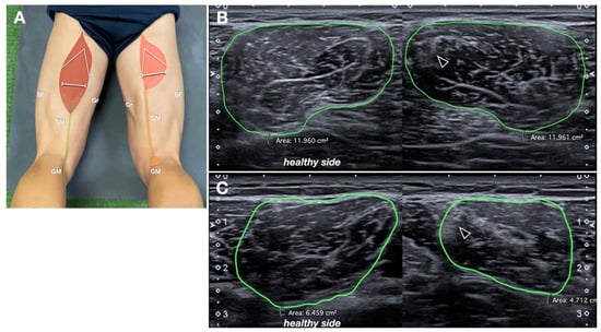 Semitendinosus muscle CSA ratio. (A) Schematic drawing (same as Figure 1B, refer to it for the abbreviations) indicating probe position. (B,C) Comparative axial sonograms in two different patients. The margins of the semitendinosus muscles are manually traced (in green) to obtain the corresponding CSA. In (B), the CSA is similar between the two sides, with only some mild echostructural alteration along the intramuscular tendon (black arrowhead) of the semitendinosus muscle. In (C), the CSA is reduced more evidently.